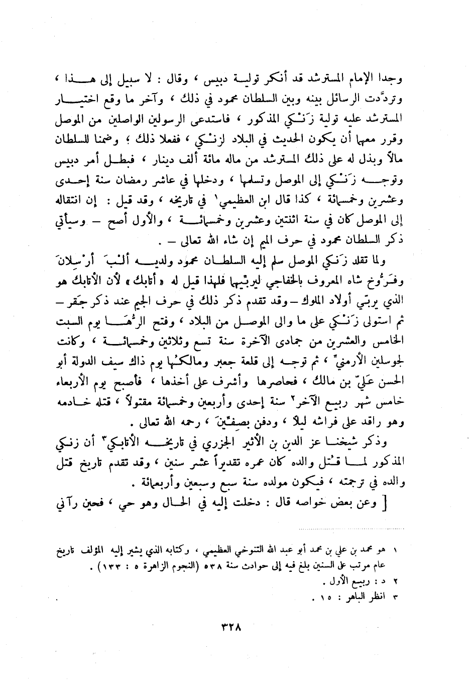 (1) هو محمد بن علي بن محمد أبو عبد الله التنوخي العظيمي، وكتابه الذي يشير إليه المؤلف تاريخ عام مرتب على السنين بلغ فيه إلى حوادث سنة 538 (النجوم الزاهرة 5: 133) .