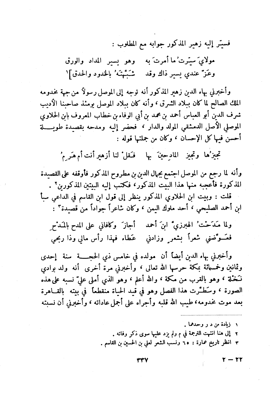 فعوضني شعراً بشعر وزادني ... عطاء فهذا رأس مالي وذا ربحي وأخبرني بهاء الدين أيضاً أن مولده في خامس ذي الحجة سنة إحدى وثمانين وخمسمائة بمكة حرسها الله تعالى، وأخبرني مرة أخرى أنه ولد بوادي نخلة، وهو بالقرب من مكة، والله أعلم، وهو الذي أملى علي نسبه على هذه الصورة، وسطرت هذا الفصل وهو في قيد الحياة منقطعاً في بيته بالقاهرة بعد موت مخدومه، طيب الله قلبه وأجراه على أجمل عاداته، وأخبرني أن نسبته