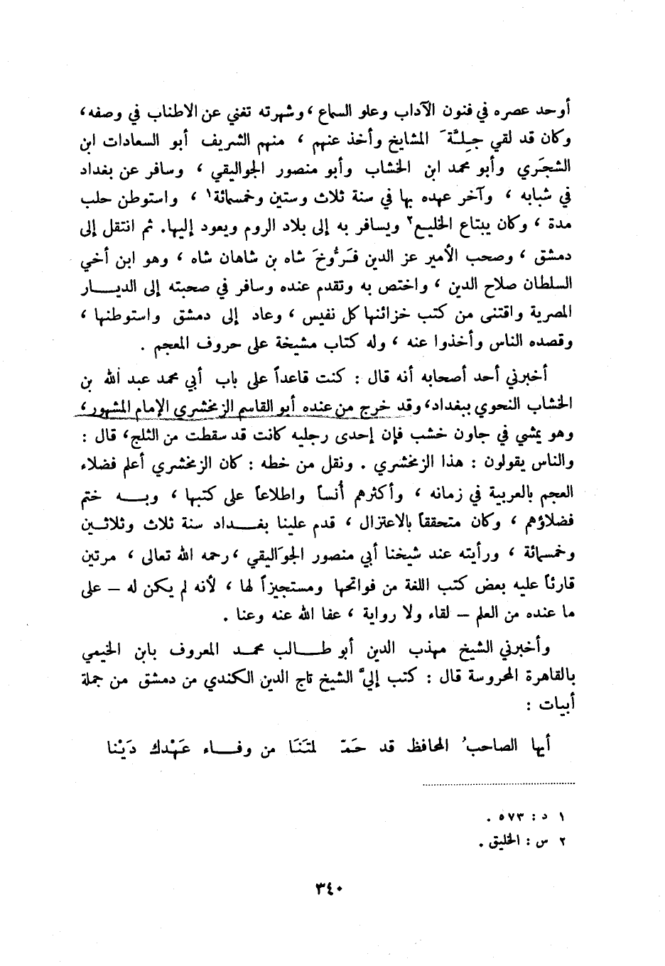 أخبرني أحد أصحابه أنه قال: كنت قاعداً على باب أبي محمد عبد الله بن الخشاب النحوي ببغداد، وقد خرج من عند أبو القاسم الزمخشري الإمام المشهور، وهو يمشي في جاون خشب فإن إحدى رجليه كانت قد سقطت من الثلج، ثال: والناس يقولون: هذا الزمخشري. ونقل من خطه: كان الزمخشري أعلم فضلاء العجم بالعربية في زمانه، وأكثرهم أنساً واطلاعاً على كتبها، وبه ختم فضلاؤهم، وكان متحققاً بالاعتزال، قدم علينا بغداد سنة ثلاث وثلاثين وخمسمائة، ورأيته عند شيخنا أبي منصور الجواليقي، رحمه الله تعالى، مرتين قارئاً عليه بعض كتب اللغة من فواتحها ومستجيزاً لها، لأنه لم يكن له على ما عنده من العلم عفا الله عنه وعنا.