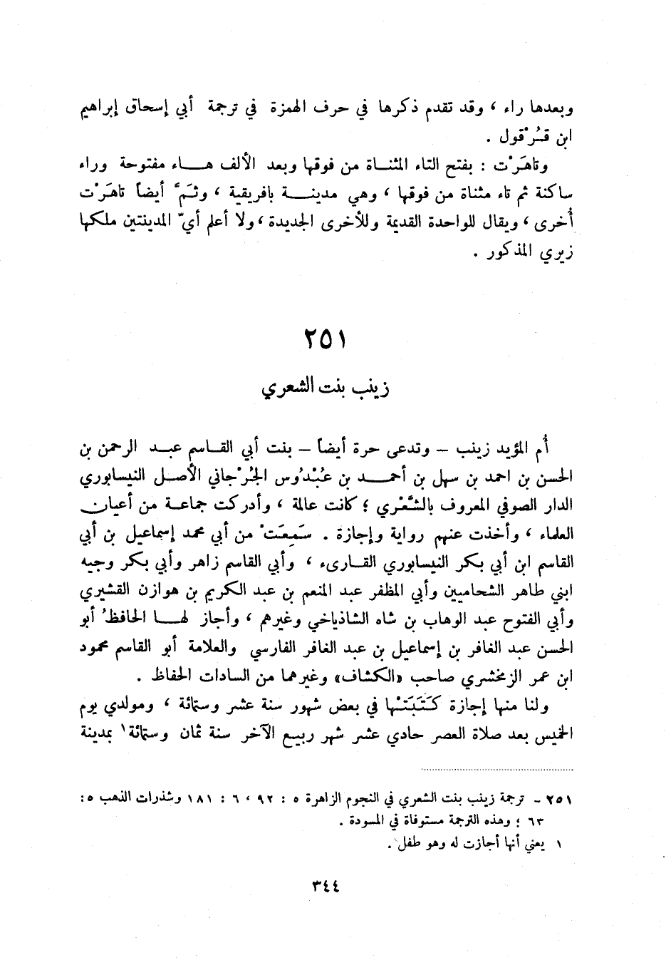 (1) ترجمة زينب بنت الشعري في النجوم الزاهرة 5: 92، 6: 181 وشذرات الذهب 5: 63؛ وهذه الترجمة مستوفاة في المسودة.