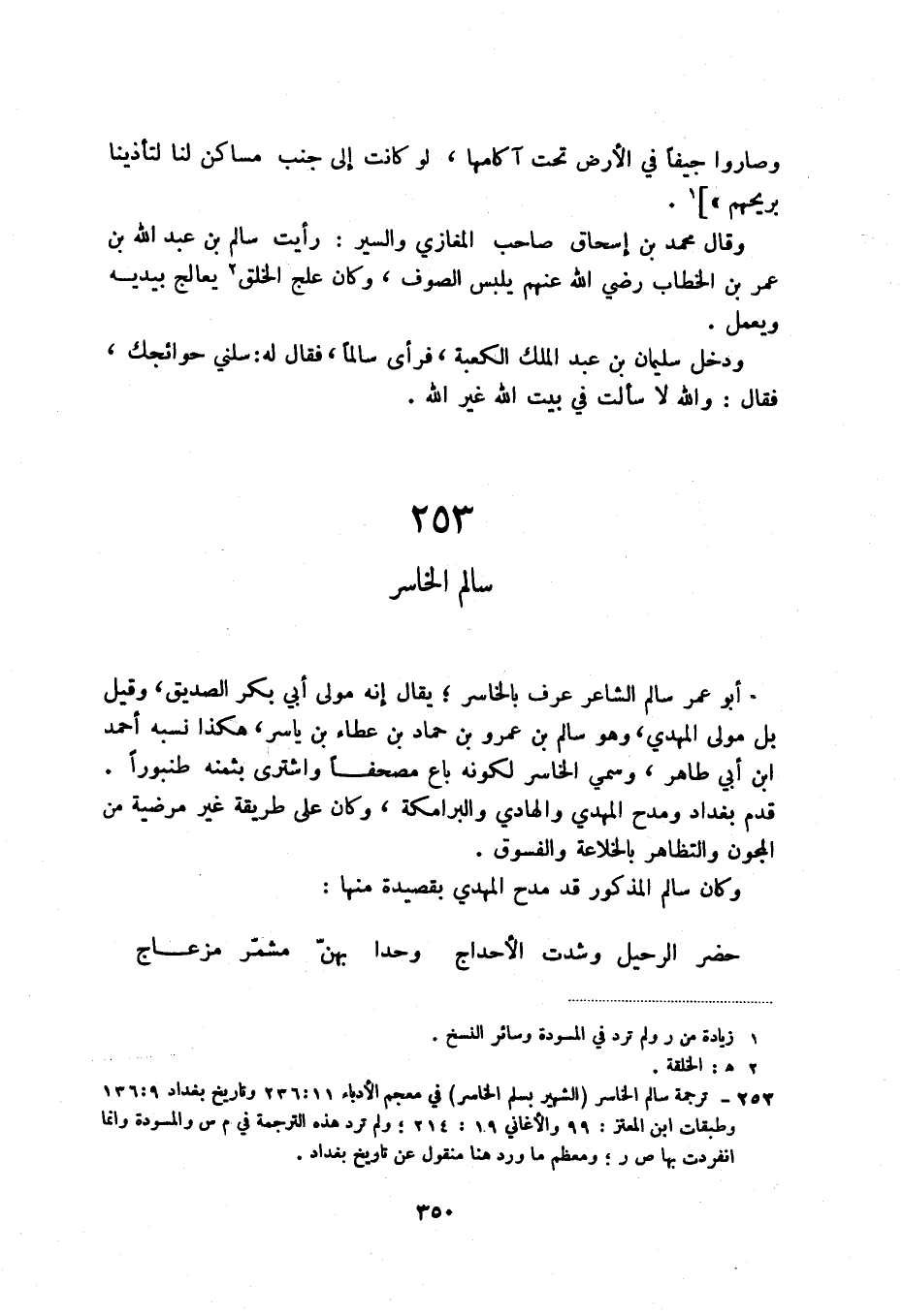 (3) ترجمة سالم الخاسر (الشهير بسلم الخاسر) في معجم الأدباء 11: 236 وتاريخ بغداد 9: 136 وطبقات ابن المعتز: 99 والأغاني 19: 214؛ ولم ترد هذه الترجمة في م س والمسودة وإنما انفردت بها ص ر؛ ومعظم ما ورد هنا منقول عن تاريخ بغداد.