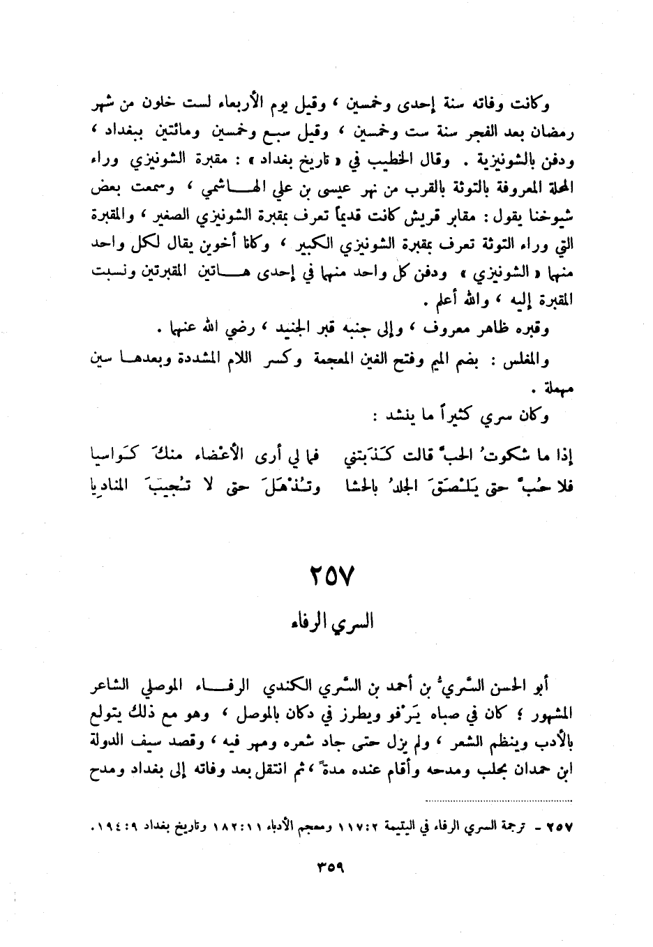(1) ترجمة السري الرفاء في اليتيمة 2: 117 ومعجم الأدباء 11: 182 وتاريخ بغداد 9: 194.