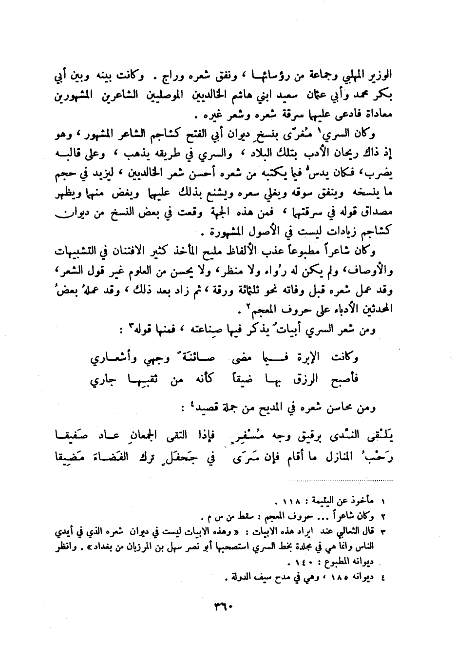 وكان السري (1) مغرى بنسخ ديوان أبي الفتح كشاجم الشاعر المشهور، وهو إذ ذاك ريحان الأدب بتلك البلاد، والسري في طريقه يذهب، وعلى قالبه يضرب، فكان يدس فيما يكتبه من شعره أحسن شعر الخالديين، ليزيد في حجم ما ينسخه وينفق سوقه ويغلي سعره ويشنع بذلك عليهما ويغض منهما ويظهر مصداق قوله في سرقتهما، فمن هذه الجهة وقعت في بعض النسخ من ديوان كشاجم زيادات ليست في الأصول المشهورة.