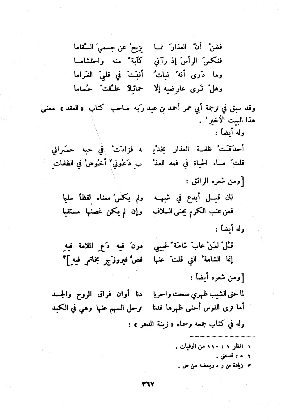 وهل ترى عارضيه إلا ... حمائلاً علقت حساما وقد سبق في ترجمة أبي عمر أحمد بن عبد ربه صاحب كتاب " العقد " معنى هذا البيت الأخير (1) .