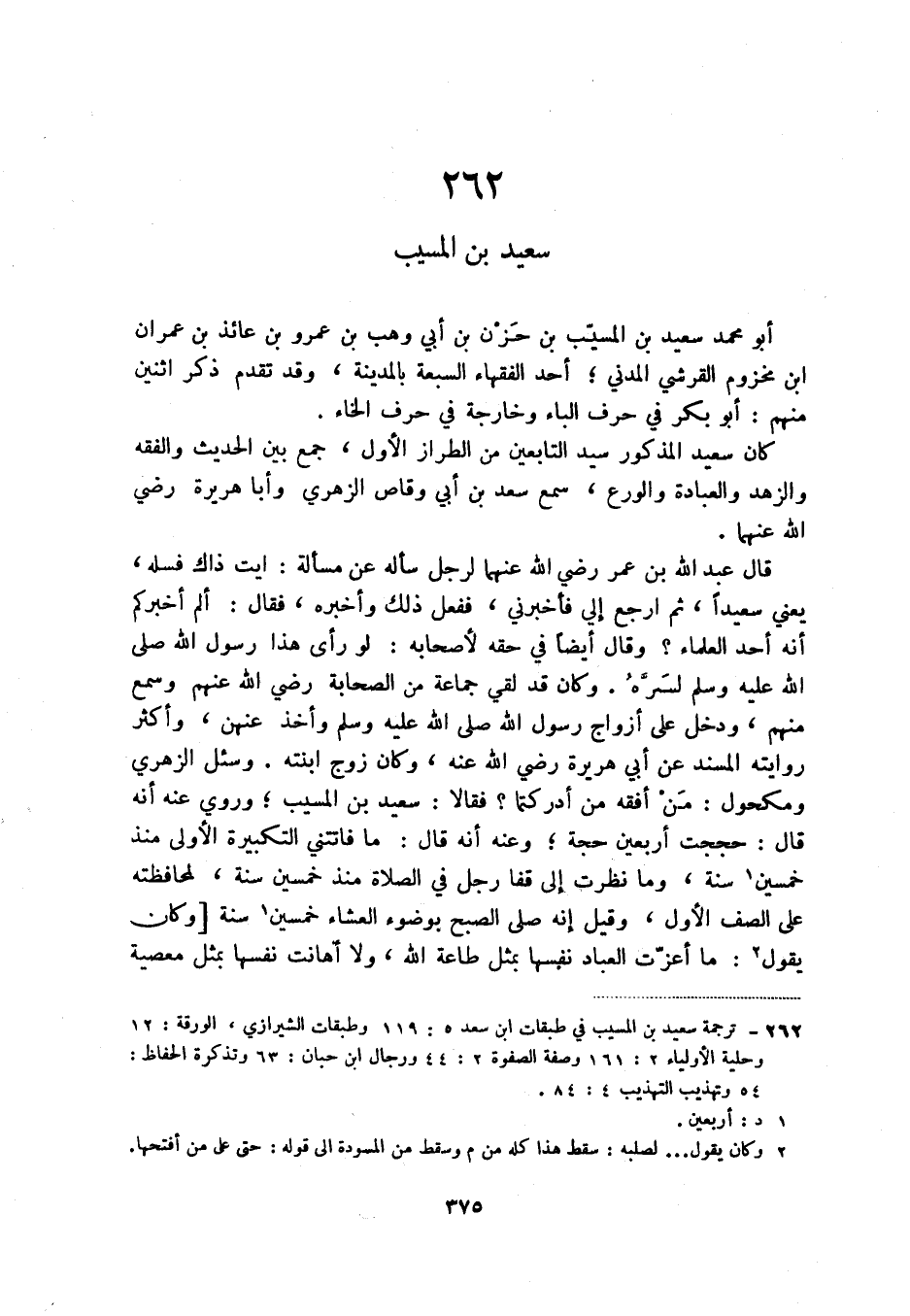 (1) ترجمة سعيد بن المسيب في طبقات ابن سعد 5: 119 وطبقات الشيرازي، الورقة: 12 وحلية الأولياء 2: 161 وصفة الصفوة 2: 44 ورجال ابن حيان: 63 وتذكرة الحفاظ: 54 وتهذيب التهذيب 4: 84.