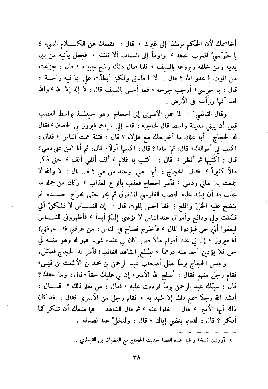 وقال القاضي (1) : لما حمل الأسري إلى الحجاج وهو حينئذ بواسط القصب قبل أن يبني مدينة واسط قال لحاجبه: قدم إلي سيدهم فيروز بن الحصين، فقال: له الحجاج: أبا عثمان ما أخرجك مع هؤلاء قال: فتنة عمت الناس، فقال: اكتب لي أموالك، قال: ثم ماذا قال: اكتبها أولاً، قال: ثم أنا آمن على دمي قال: اكتبها ثم أنظر، قال: اكتب يا غلام، ألف ألفي الف، حتى ذكر مالاً كثيراً، فقال الحجاج: أين هي وعند من هي قال: لا والله لا جمعت بين مالي ودمي، فأمر الحجاج فعذب بأنواع العذاب، وكان من جملة ما عذب به أن يشد عليه القصب الفارسي المشقوق ثم يجر حتى يجرح جسده ثم ينضح عليه الخل والملح؛ فلما أحس بالموت قال: إن الناس لا تشكن أني قتلت ولي ودائع وأموال عند الناس لا تؤدى إليكم أبداً، فأظهروني للناس ليعلموا أني حي فيؤدوا المال، فأخرج قصاح في الناس: من عرفني فقد عرفني؛ أنا فيروز، إن لي عند أقوام مالاً فمن كان لي عنده شيء فهو له وهو منه في حل فلا يؤدين أحد منه درهماً، ليبلغ الشاهد الغائب؛ فأمر به الحجاج فقتل.