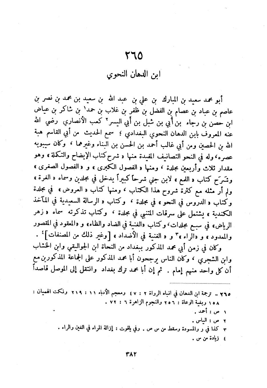 أبو محمد سعيد بن المبارك بن علي بن عبد الله بن سعيد بن محمد بن نصر بن عاصم بن عبادة بن عصام بن الفضل بن ظفر بن غلاب بن حمد (2) بن شاكر بن عياض ابن حصن بن رجاء بن أبي بن شبل بن أبي اليسر (3) كعب الأنصاري رضي الله عنه المعروف بابن الدهان النحوي البغدادي؛ سمع الحديث من أبي القاسم هبة الله بن الحصين ومن أبي غالب أحمد بن الحسن بن البناء وغيرهما، وكان سيبويه عصره، وله في النحو التصانيف المفيدة منها " شرح كتاب الإيضاح والتكملة " وهو مقدار ثلاث وأربعين مجلدة، ومنها " الفصول الكبرى " و " الفصول الصغرى " وشرح كتاب " اللمع " لابن جني شرحاً كبيراً يدخل في مجلدين وسماه " الغرة " ولم أر مثله مع كثرة شروح هذا الكتاب، ومنها كتاب " العروض " في مجلدة وكتاب " الدروس في النحو " في مجلدة، وكتاب تذكرته سماه " زهر الرياض " في سبع مجلدات، كتاب " الغنية في الضاد والظاء " و " المعقود في المقصور والممدود " و " الراء " (4) و " الغنية في الأضداد " [وغير ذلك من المصنفات] (5) .
