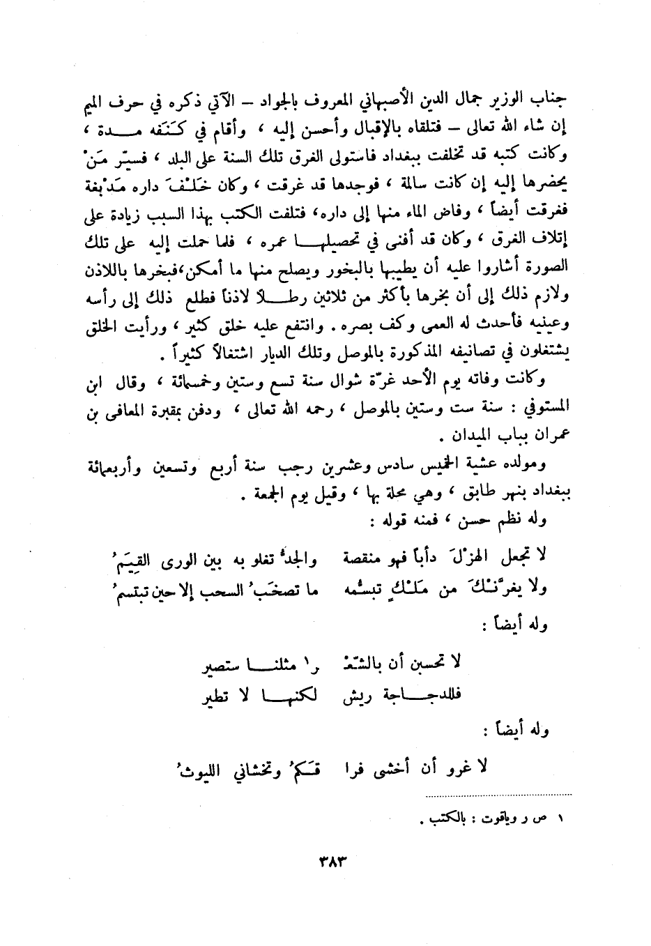 جناب الوزير جمال الدين الأصبهاني المعروف بالجواد - الآتي ذكره في حرف الميم إن شاء الله تعالى - فتلقاه بالإقبال وأحسن إليه، وأقام في كنفه مدة، وكانت كتبه قد تخلفت ببغداد فاستولى الغرق تلك السنة على البلد، فسير من يحضرها إليه إن كانت سالمة، فوجدها قد غرقت، وكان خلف داره مدبغة فغرقت أيضاً، وفاض الماء منها إلى داره، فتلفت الكتب بهذا السبب زيادة على إتلاف الغرق، وكان قد أفنى في تحصيلها عمره، فلما حملت إليه على تلك الصورة أشاروا عليه أن يطيبها بالبخور ويصلح منها ما أمكن، فبخرها باللاذن ولازم ذلك إلى أن بخرها بأكثر من ثلاثين رطلاً لاذناً فطلع ذلك إلى رأسه وعينيه فأحدث له العمى وكف بصره. وانتفع عليه خلق كثير، ورأيت الخلق يشتغلون في تصانيفه المذكورة بالموصل وتلك الديار اشتغالاً كثيراً.