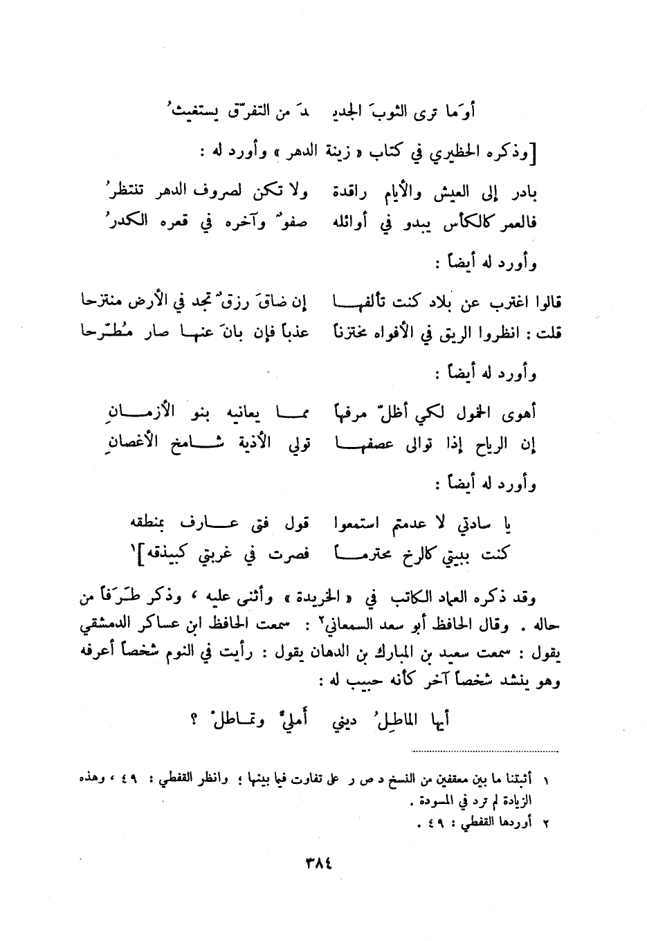 أو ترى الثوب الجدي ... د من التفرق يستغيث [وذكره الحظيري في كتاب " زينة الدهر " وأورد له: