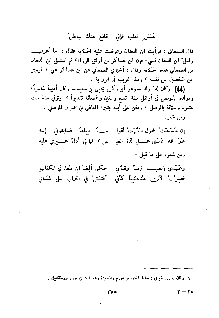 علل القلب فإني ... قانع منك بباطل قال السمعاني: فرأيت ابن الدهان وعرضت عليه الحكاية فقال: ما أعرفها ولعل ابن الدهان نسي، فإن ابن عساكر من أوثق الرواة، ثم استملى ابن الدهان من السمعاني هذه الحكاية وقال: أخبرني السمعاني عن ابن عساكر عني، فروى عن شخصين عن نفسه، وهذا غريب في الرواية.