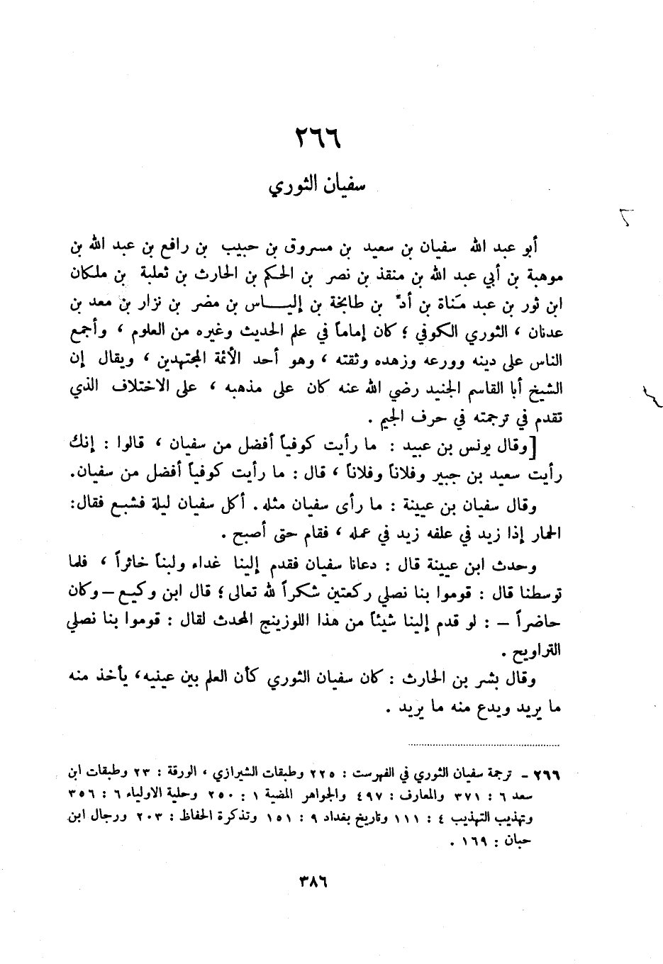 (1) ترجمة سفيان الثوري في الفهرست: 225 وطبقات الشيرازي، الورقة: 23 وطبقات ابن سعد 6: 371 والمعارف: 497 والجواهر المضية 1: 250 وحلية الأولياء 6: 356 وتهذيب التهذيب 4: 111 وتاريخ بغداد 9: 151 وتذكرة الحفاظ: 203 ورجال ابن حبان: 169.
