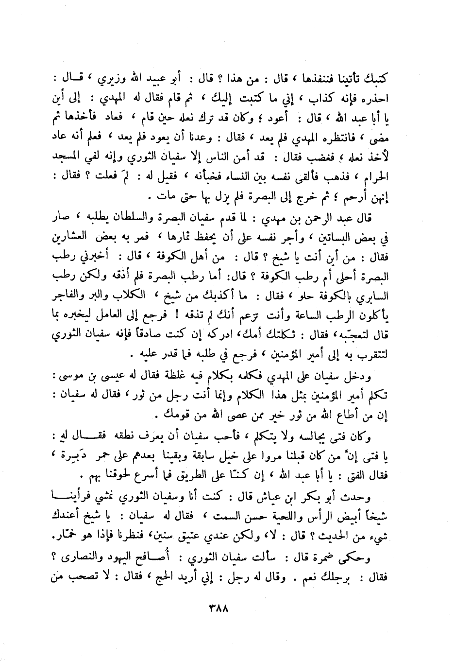 كتبك تأتينا فننفذها، قال: من هذا قال: أبو عبيد الله وزيري، قال: احذره فإنه كذاب، إني ما كتبت إليك، ثم قام فقال له المهدي: إلى أين با أبا عبد الله، قال: أعود؛ وكان قد ترك نعله حين قامن فعاد فأخذها ثم مضى، فانتظره المهدي فلم يعد، فقال: وعدنا أن يعود فلم يعد، فعلم أنه عاد لأخذ نعله، فغضب فقال: قد أمن الناس إلا سفيان الثوري وإنه لفي المسجد الحرام، فذهب فألقى نفسه بين النساء فخبأنه، فقيل له: لم فعلت فقال: إنهن أرحم؛ ثم خرج إلى البصرة فلم يزل بها حتى مات.