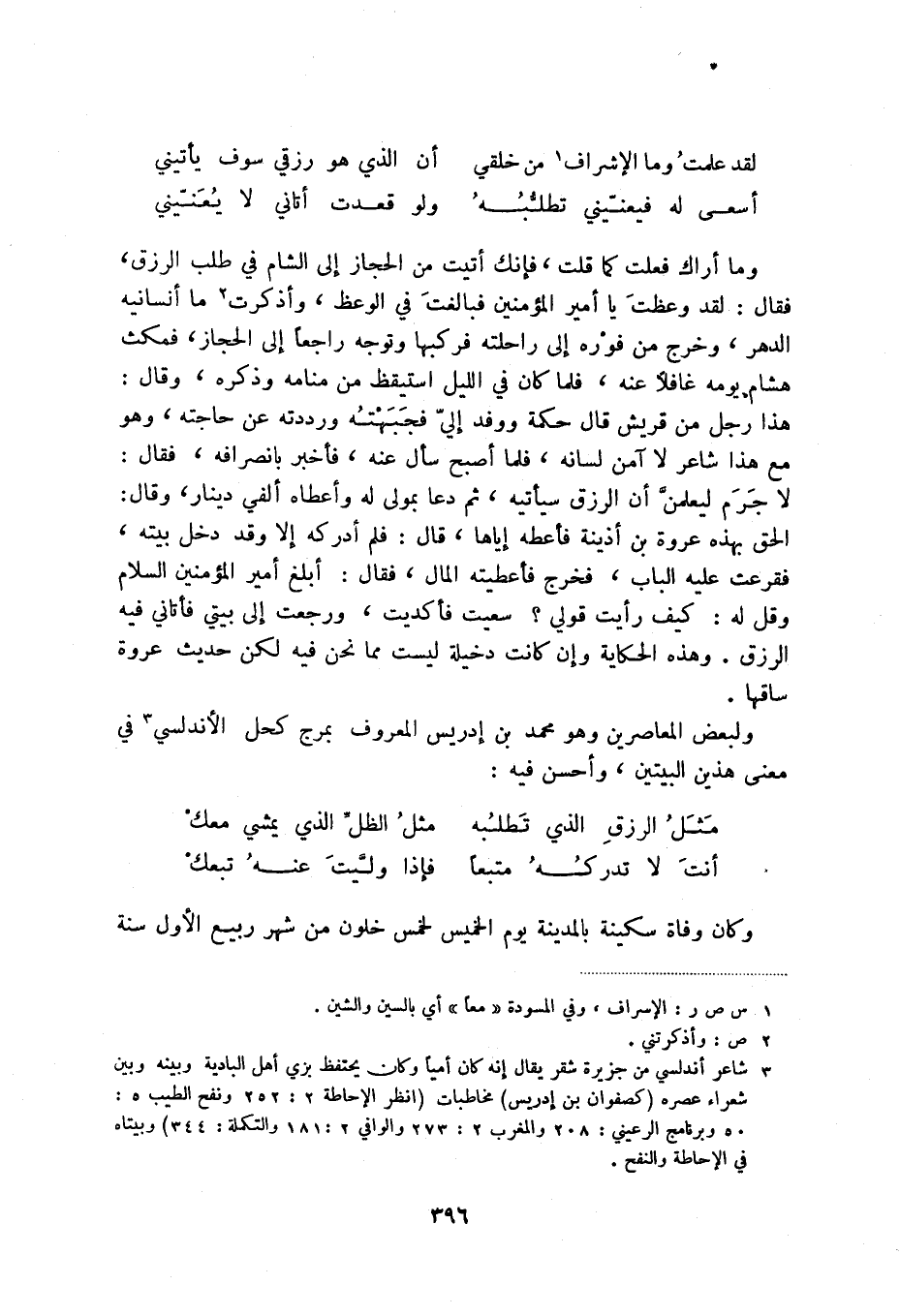 أسعى له فيعنيني تطلبهُ ... ولو قعدت أتاني لا يُعنيني وما أراك فعلت كما قلت، فإنك أتيت من الحجاز إلى الشام في طلب الرزق، فقال: لقد وعظت يا أمير المؤمنين فبالغت في الوعظ، وأذكرت (2) ما أنسانيه الدهر، وخرج من فروه إلى راحلته فركبها وتوجه راجعاً إلى الحجاز، فمكث هشام يومه غافلاً عنه، فلما كان في الليل استيقظ من منامه وذكره، وقال: هذا رجل من قريش قال حكمة ووفد إلي فجبهته ورددته عن حاجته، وهو مع هذا شاعر لا آمن لسانه، فلما أصبح سأل عنه، فأخبر بانصرافه، فقال: لا جرم ليعلمن أن الرزق سيأتيه، ثم دعا بمولى له وأعطاه ألفي دينار، وقال: الحق بهذه عروة بن أذينة فأعطه إياها، قال: فلم أدركه إلا وقد دخل بيته، فقرعت عليه الباب، فخرج فأعطيته المال، فقال: أبلغ أمير المؤمنين السلام وقل له: كيف رأيت قولي سعيد فأكديت، ورجعت إلى بيتي فأتاني فيه الرزق. وهذه الحكاية وغن كانت دخيلة ليست مما نحن فيه لكن حديث عروة ساقها.