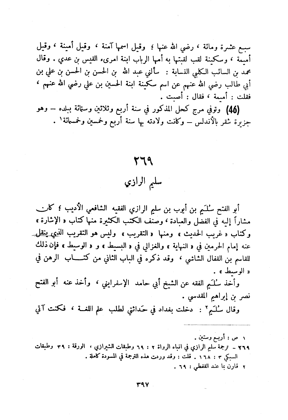 (2) ترجمة سليم الرازي في إنباه الرواة 2: 69 وطبقات الشيرازي، الورقة: 39 وطبقات السبكي 3: 168. قلت: وقد وردت هذه الترجمة في المسودة كاملة.