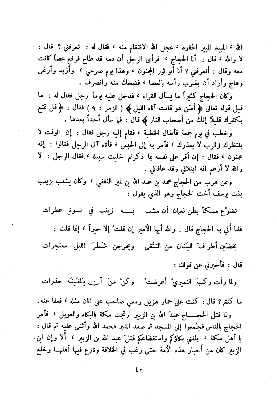 الله، المبيد المبير الحقود، عجل الله الانتقام منه، فقال له: تعرفني قال: لا والله، قال: أنا الحجاج، فرأى الرجل أن دمه قد طاح فرفع عصاً كانت معه وقال: أتعرفني أنا أبو ثور المجنون، وهذا يوم صرعي، وأزبد وأرغى وهاج وأراد أن يضرب رأسه بالعصا، فضحك منه وانصرف.