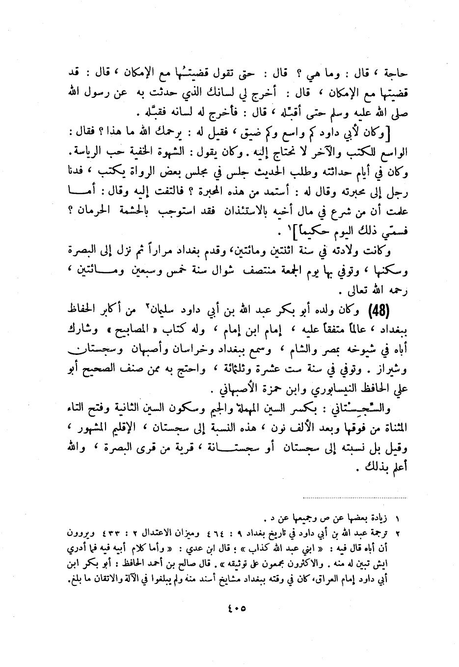 (2) ترجمة عبد الله بن أبي داود في تاريخ بغداد 9: 464 وميزان الاعتدال 2: 433 ويروون أن أباه قال فيه: " بني عبد الله كذاب "؛ قال ابن عدي: " وأما كلام أبيه فيه فما أدري أيش تبين له منه. والأكثرون مجمعون على توثيقه ". قال صالح بن أحمد الحافظ: أبو بكر ابن أبي داود إمام العراق، كان في وقته ببغداد مشايخ أسند منه ولم يبلغوا في الآلة والاتقان ما بلغ.