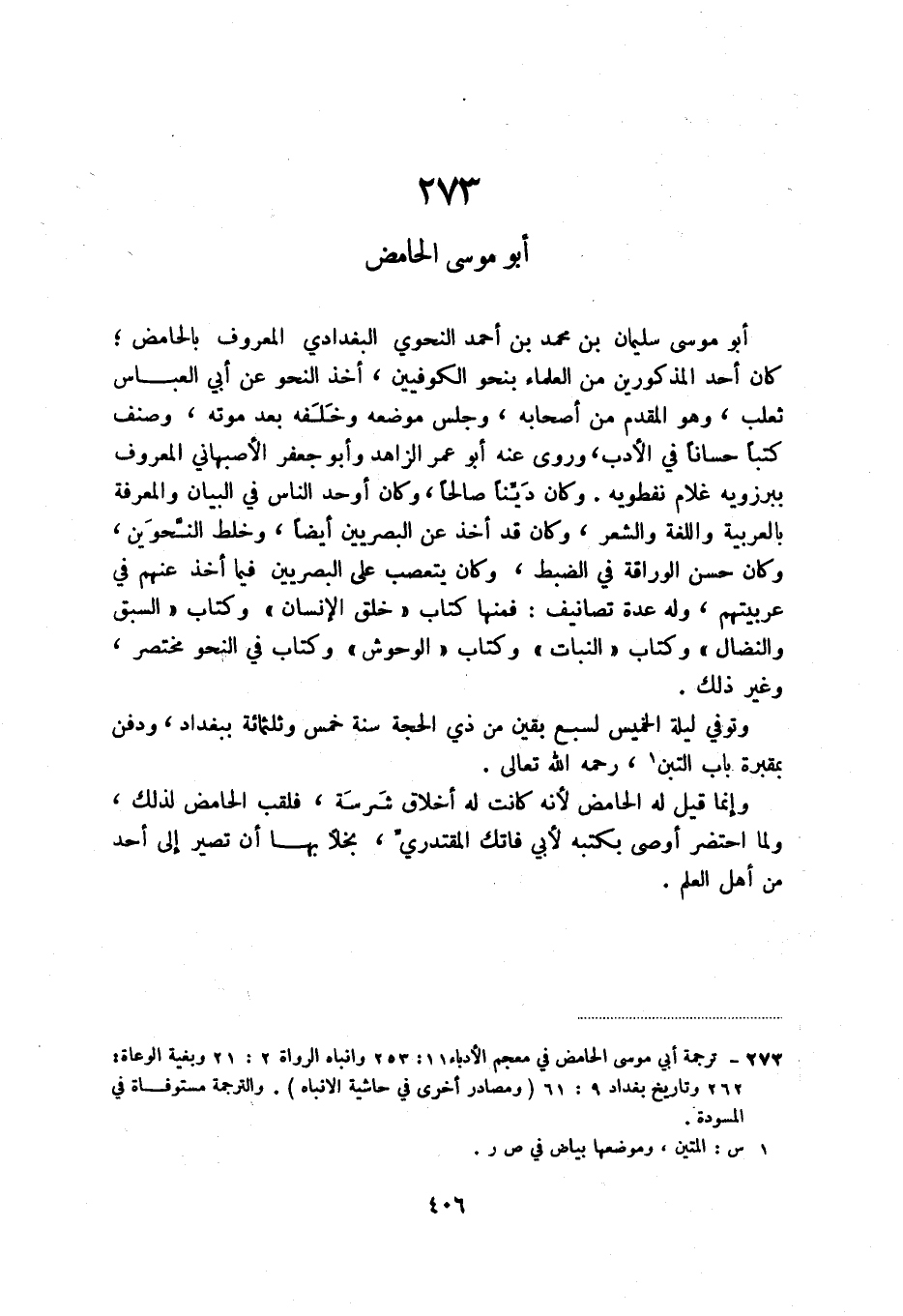 (1) ترجمة أبي موسى الحامض في معجم الأدباء 11: 253 وانباه الرواة 2: 21 وبغية الوعاة: 262 وتاريخ بغداد 9: 61 (ومصادر أخرى في حاشية الانباه) . والترجمة مستوفاة في المسودة.