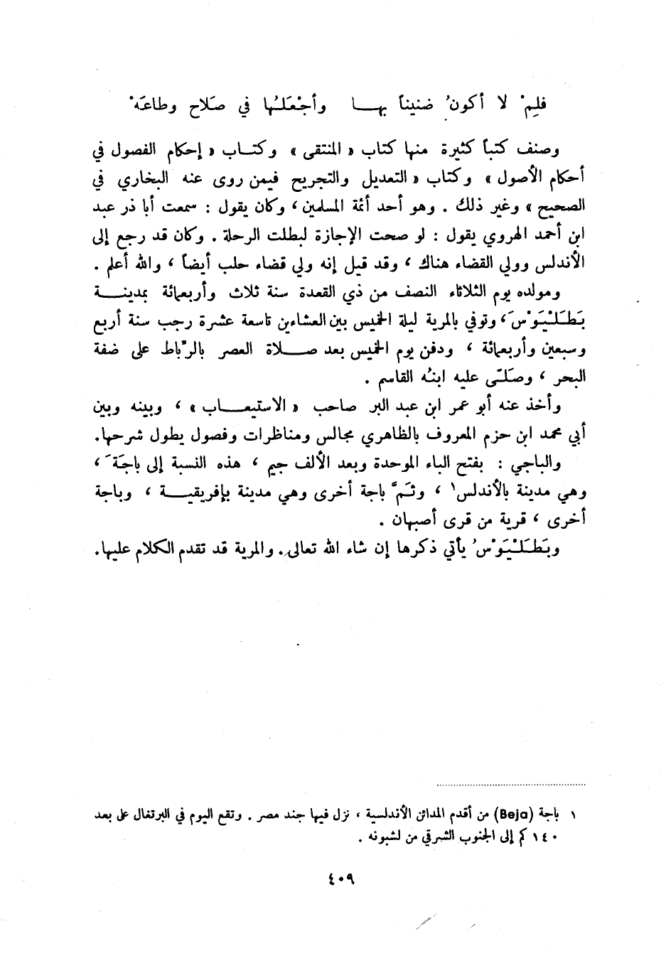 فلم لا أكون ضنيناً بها ... وأجعلها في صلاح وطاعه وصنف كتباً كثيرة منها كتاب " المنتقى " وكتاب " إحكام الفصول في أحكام الأصول " وكتاب " التعديل والتجريح فيمن روى عنه البخاري في الصحيح " وغير ذلك. وهو أحد أئمة المسلمين، وكان يقول: سمعت أبا ذر عبد ابن أحمد الهروي يقول: لو صحت الإجازة لبطلت الرحلة. وكان قد رجع إلى الأندلس وولي القضاء هناك، وقد قيل إنه ولي قضاء حلب أيضاً، والله أعلم.