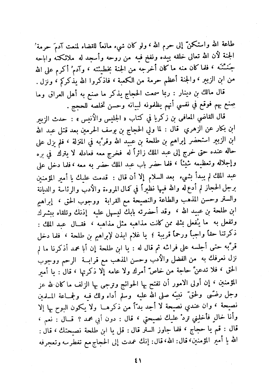 قال القاضي المعافى بن زكريا في كتاب الجليس والأنيس: حدث الزبير ابن بكار عن الزهري قال: لما ولي الحجاج بن يوسف الحرمين بعد قتل عبد الله ابن الزبير استحضر إبراهيم بن طلحة بن عبيد الله وقربه في المنزلة، فلم يزل على حاله عنده حتى خرج إلى عبد الملك زائراً له فخرج معه فعادله لا يترك في بره وإجلاله وتعظيمه شيئاً، فلما حضر باب عبد الملك حضر به معه، فلما دخل على عبد الملك لم يبدأ بشيء بعد السلام إلا أن قال: قدمت عليك يا أمير المؤمنين برجل الحجاز لم أدع له والله فيها نظيراً في كمال المروءة والأدب والرئاسة والديانة والستر وحسن المذهب والطاعة والنصيحة مع القرابة ووجوب الحق، إبراهيم ابن طلحة بن عبيد الله، وقد أحضرته بابك ليسهل عليه إذنك وتلقاه ببشرك وتفعل به ما يفعل بمثله ممن كانت مذاهبه، فقال عبد الملك: ذكرتنا حقاً واجباً ورحماً قريبة؛ يا غلام ايذن لإبراهيم بن طلحة، فلما دخل قربه حتى أجلسه على فراشه ثم قال له: يا ابن طلحة إن أبا محمد أذكرنا ما لم نزل نعرفك به من الفضل والأدب وحسن المذهب مع قرابة الرحم ووجوب الحق، فلا تدعن حاجة من خاص أمرك ولا عامه إلا ذكرتها، قال: يا أمير المؤمنين، إن أولى الأمور أن تفتح بها الحوائج وترجى به الزلف ما كان لله عز وجل رضى ولحق نبيه صلى الله عليه وسلم أداء ولك فيه ولجماعة المسلمين نصيحة، وأن عندي نصيحة لا أجد بداً من ذكرها ولا يكون البوح بها إلا وأنا خال فأخلني ترد عليك نصيحتي، قال: دون أبي محمد قال: نعم، قال: قم يا حجاج، فلما جاوز الستر قال: قل يا ابن طلحة نصيحتك، قال: الله يا أمير المؤمنين، قال: الله، قال: إنك عمدت إلى الحجاج مع تغطرسه وتعجرفه