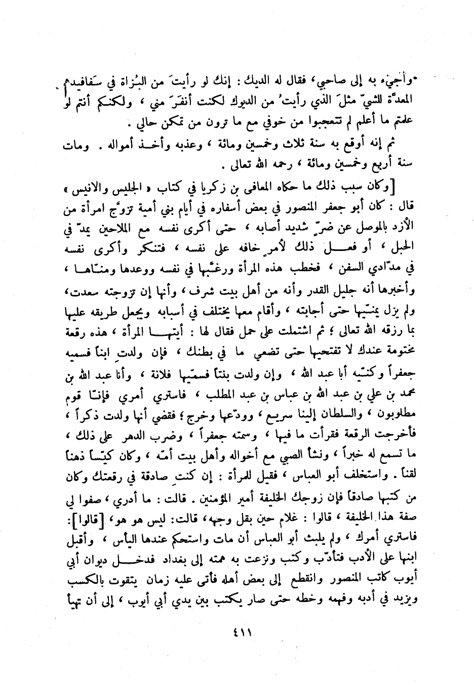 [وكان سبب ذلك ما حكاه المعافى بن زكريا في كتاب " الجليس والأنيس " قال: كان أبو جعفر المنصور في بعض أسفاره في أيام بني أمية تزوج امرأة من الأزد بالموصل عن ضر شديد أصابه، حتى أكرى نفسه مع الملاحين يمد في الحبل، أو فعل ذلك لأمر خافه على نفسه، فتنكر وأكرى نفسه في مدادي السفن، فخطب هذه المرأة ورغبها في نفسه ووعدها ومناها، وأخبرها أنه جليل القدر وأنه من أهل بيت شرف، وأنها إن تزوجته سعدت، ولم يزل يمنيها حتى أجابته، وأقام معها يختلف في أسبابه ويجعل طريقه عليها بما رزقه الله تعالى؛ ثم اشتملت على حمل فقال لها: أيتها المرأة، هذه رقعة مختومة عندك لا تفتحيها حتى تضعي ما في بطنك، فإن ولدت ابناً فسميه جعفراً وكنيه أبا عبد الله، وإن ولدت بنتاً فسميها فلانة، وأنا عبد الله بن محمد بن علي بن عبد الله بن عباس بن عبط المطلب، فاستري أمري فإنا قوم مطلوبون، والسلطان إلينا سريع، وودعها وخرج؛ فقضي أنها ولدت ذكراً، فأخرجت الرقعة فقرأت ما فيها، وسمته جعفراً، وضرب الدهر على ذلك، ما تسمع له خبراً، ونشأ الصبي مع أخواله وأهل بيت أمه، وكان كيساً ذهناً لقناً، واستخلف أبو العباس، فقيل للمرأة: إن كنت صادقة في رقعتك وكان من كتبها صادقاً فإن زوجك الخليفة أمير المؤمنين. قالت: ما أدري، صفوا لي صفة هذا الخليفة، قالوا: غلام حين بقل وجهه، قالت: ليس هو هو، قالوا: فاستري أمرك، ولم يلبث أبو العباس أن مات واستحكم عندها اليأس، وأقبل ابنها على الأدب فتأدب وكتب ونزعت به همته إلى بغداد فدخل ديوان أبي أيوب كاتب المنصور وانقطع إلى بعض أهله فأتى عليه زمان يتقوت بالكسب ويزيد في أدبه وفهمه وخطه حتى صار يكتب بين يدي أبي أيوب، إلى أن تهيأ
