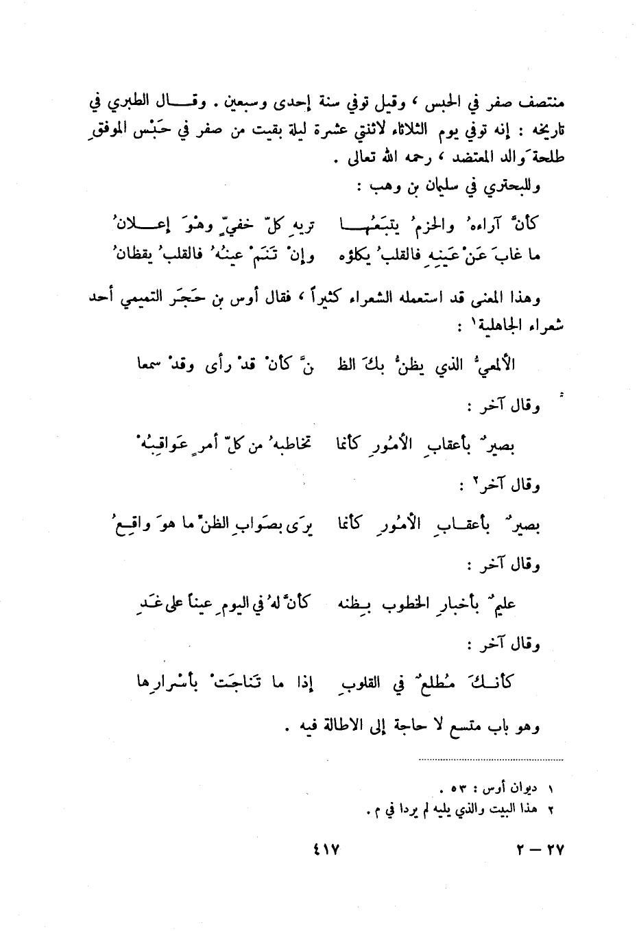 ما غاب عن عينه فالقلب يكلؤه ... وإن تنم عينه فالقلب يقظان وهذا المعنى قد استعمله الشعراء كثيراً، فقال أوس بن حجر التميمي أحد شعراء الجاهلية (1) :