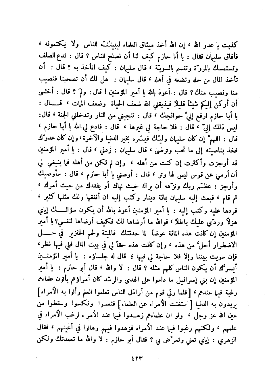 كذبت يا عدو الله، إن الله أخذ ميثاق العلماء ليبيننه للناس ولا يكتمونه، فأفاق سليمان فقال: يا أبا حازم كيف لنا أن نصلح للناس قال: تدع الصلف وتستمسك بالمروة وتقسم بالسوية، قال سليمان: كيف المأخذ به قال: أن تأخذ المال من حله وتضعه في أهله، قال سليمان: هل لك أن تصحبنا فتصيب منا ونصيب منك قال: أعوذ بالله يا أمير المؤمنين! قال: ولم قال: أشخى أن أركن إليكم شيئاً قليلاً فيذيقني الله ضعف الحياة وضعف الممات، قال: يا أبا حازم ارفع إلي حوائجك، قال: تنجيني من النار وتدخلني الجنة، قال: ليس ذلك غلي، قال: فلا حاجة لي غيرها، قال: فادع لي الله يا أبا حازم، قال: اللهم إن كان سليمان وليك فيسره بخير الدنيا والآخرة، وإن كان عدوك فخذ بناصيته إلى ما تحب وترضى، قال سليمان: زدني، قال: يا أمير المؤمنين قد أوجزت وأكثرت إن كنت من أهله، وإن لم تكن من أهله فيما ينبغي لي أن أرمي عن قوس ليس لها وتر، قال: أوصني يا أبا حازم، قال: سأوصيك وأوجز: عظم ربك ونزهه أن يراك حيث نهاك أو يفقدك من حيث أمرك، ثم قام، فبعث إليه سليمان بمائة دينار وكتب إليه أن أنفقها ولك مثلها كثير، فردها عليه وكتب إليه: يا أمير المؤمنين أعوذ بالله أن يكون سؤالك إياي هزلاً وردي عليك باطلاً، فو الله ما أرضاها لك فكيف أرضاها لنفسي يا أمير المؤمنين إن كانت هذه المائة عوضاً لما حدثتك فالميتة ولحم الخنزير في حل الاضطرار أحل من هذه، وإن كانت هذه حقاً لي في بيت المال فلي فيها نظر، فإن سويت بيننا وإلا فلا حاجة لي فيها؛ قال له جلساؤه: يا أمير المؤمنين أيسرك أن يكون الناس كلهم مثله قال: لا والله، قال أبو حازم: يا أمير المؤمنين إن بني إسرائيل ما داموا على الهدى والرشد كان أمراؤهم يأتون علماءهم رغبة فيما عندهم، [فلما رئي قوم من أراذل الناس تعلموا العلم وأتوا به الأمراء] يريدون به الدنيا [استغنت الأمراء عن العلماء] فتعسوا ونكسوا وسقطوا من عين الله عز وجل، ولو أن علماءهم زهدوا فيما عند الأمراء لرغب الأمراء في علمهم، ولكنهم رغبوا فيما عند الأمراء فزهدوا فيهم وهانوا في أعينهم، فقال: الزهري: إياي تعني وتعرض بي فقال أبو حازم: لا والله ما تعمدتك ولكن