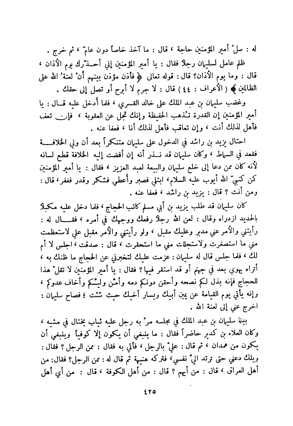 ظلم عامل لسليمان رجلاً فقال: يا أمير المؤمنين إني أحذرك يوم الأذان، قال: وما يوم الأذان قال: قوله تعالى: (فأذن مؤذن بينهم أن لعنة الله على الظالمين) ، قال: لا جرم لا أبرح أو تصل إلى حقك.