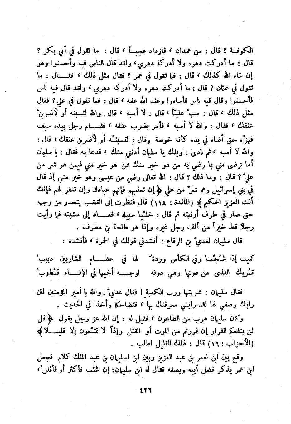 الكوفة قال: من همدان، فازداد عجباً، قال: ما تقول في أبي بكر قال: ما أدركت دهره ولا أدركه دهري، ولقد قال الناس فيه وأحسنوا وهو إن شاء الله كذلك، قال: فما تقول في عمر فقال مثل ذلك، فقال: ما تقول في عثمان قال: ما أدركت دهره ولا أدركه دهري، ولقد قال فيه ناس فأحسنوا وقال فيه ناس فأساءوا وعند الله علمه، قال: فما تقول في علي فقال مثل ذلك، قال: سب علياً، قال: لا أسبه، قال: والله لتسبنه أو لأضربن عنقك، فقال: والله لا أسبه، فأمر بضرب عنقه، فقام رجل بيده سيف فهزه حتى أضاء في يده كأنه خوصة وقال: لتسبنه أو لأضربن عنقك، قال: والله لا أسبه، ثم نادى: ويلك يا سليمان أدنني منك، فدعا به فقال: يا سليمان أما ترضى مني بما رضي به من هو خير منك ممن هو خير مني فيمن هو الشركة المتعهدة من علي قال: وما ذلك قال: الله تعالى رضي من عيسى وهو خير مني إذ قال في بني إسرائيل وهم الشركة المتعهدة من علي: (إن تعذبهم فإنهم عبادك وإن تغفر لهم فإنك أنت العزيز الحكيم) . قال فنظرت إلى الغضب يتحدر من وجهه حتى صار في طرف أرنبته ثم قال: خليا سبيله، فعاد إلى مشيته فما رأيت رجلاً قط خيراً من ألف رجل غيره وإذا هو طلحة بن مطرف.
