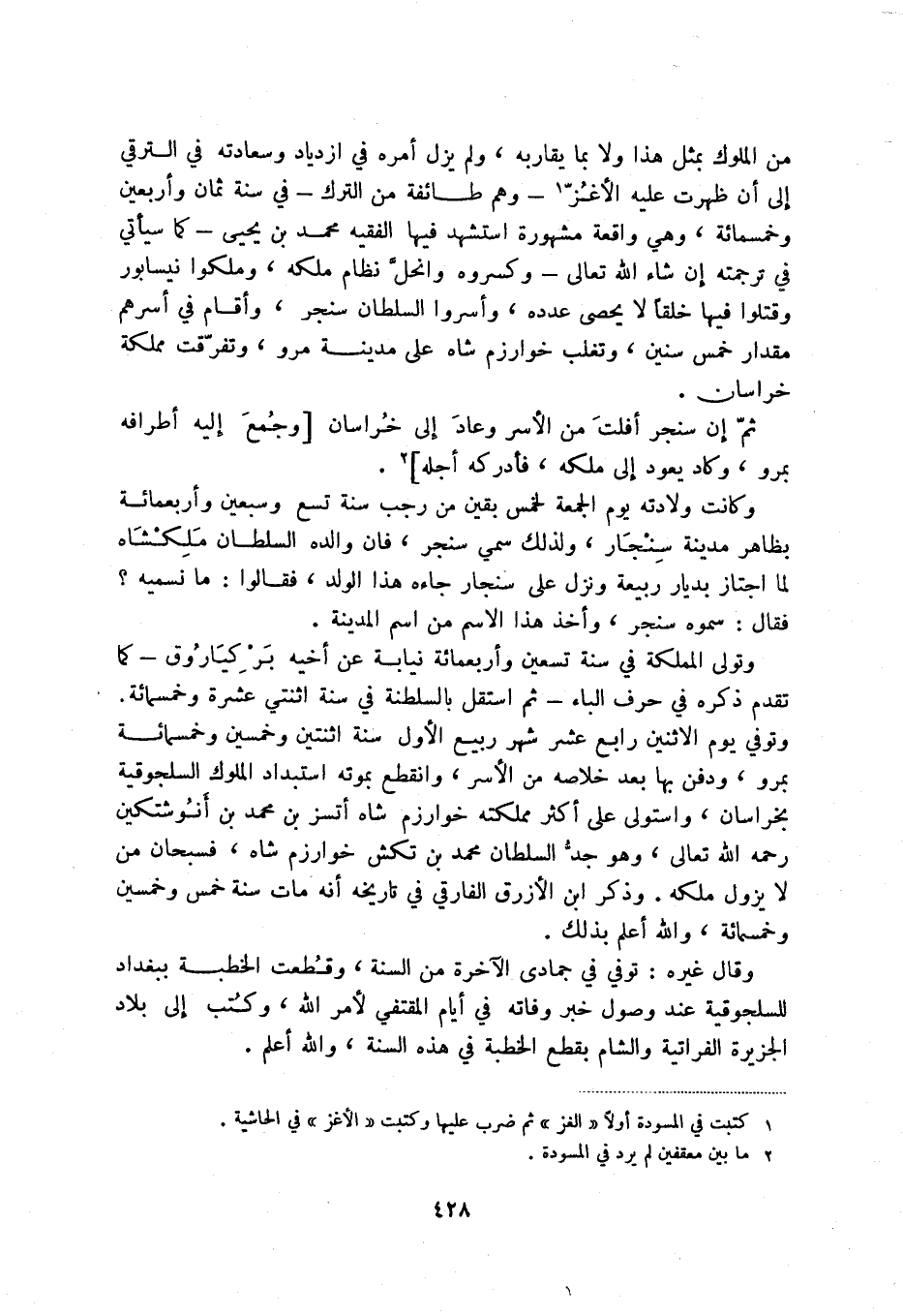 من الملوك بمثل هذا ولا بما يقاربه، ولم يزل أمره في ازدياد وسعادته في الترقي إلى أن ظهرت عليه الأغز (1) - وهم طائفة من الترك - في سنة ثمان وأربعين وخمسمائة، وهي واقعة مشهورة استشهد فيها الفقيه محمد بن يحيى - كما سيأتي في ترجمته إن شاء الله تعالى - وكسروه وانحل نظام ملكه، وملكوا نيسابور وقتلوا فيها خلقاً لا يحصى عدده، وأسروا السلطان سنجر، وأقام في اسرهم مقدار خمس سنين، وتغلب خوارزم شاه على مدينة مرو، وتفرقت مملكة خراسان.