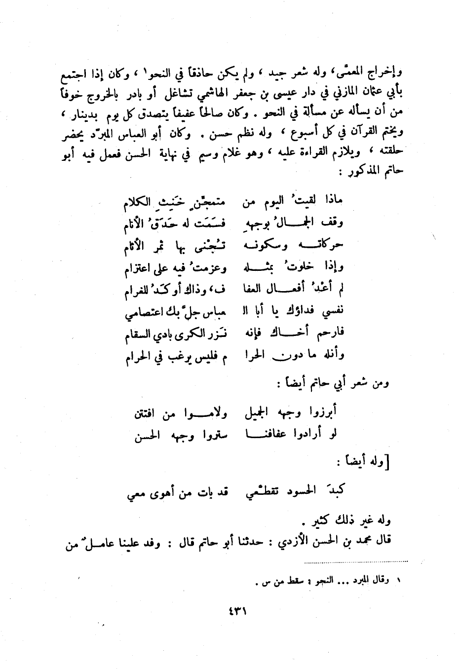 وإخراج المعمى، وله شعر جيد، ولم يكن حاذقاً في النحو (1) ، وكان إذا اجتمع بأبي عثمان المازني في دار عيسى بن جعفر الهاشمي تشاغل أو بادر بالخروج خوفاً من أن يسأله عن مسألة في النحو. وكان صالحاً عفيفاً يتصدق كل يوم بدينار، ويختم القرآن في كل أسبوع، وله نظم حسن. وكان أبو العباس المبرد يحضر حلقته، ويلازم القراءة عليه، وهو غلام وسيم في نهاية الحسن فعمل فيه أبو حام المذكور: