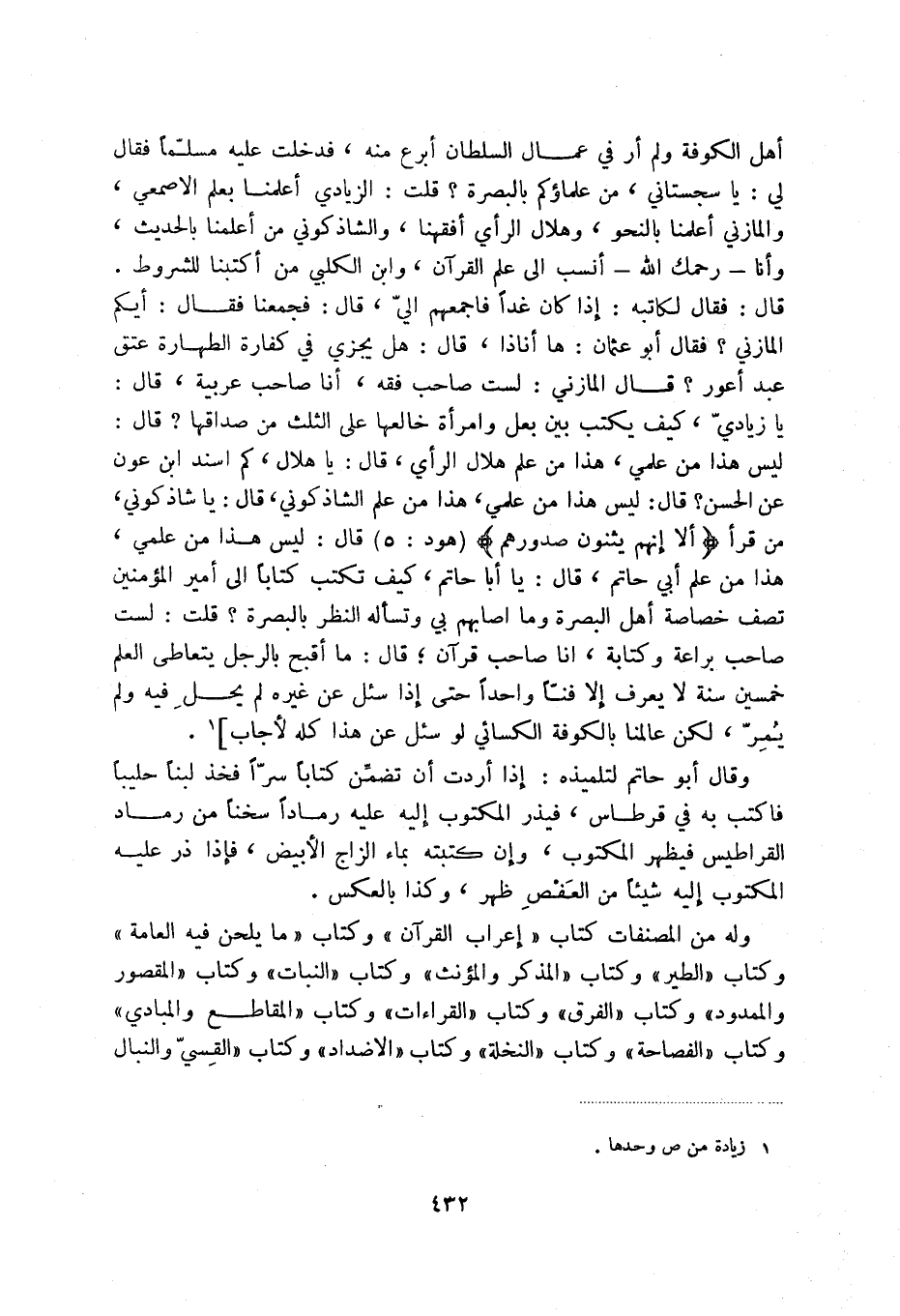 أهل الكوفة ولم أر في عمال السلطان أبرع منه، فدخلت عليه مسلماً فقال لي: يا سجستاني، من علماؤكم بالبصرة قلت: الزيادي أعلمنا بعلم الأصمعي، والمازني أعلمنا بالنحو، وهلال الرأي أفقهنا، والشاذكوني من أعلمنا بالحديث، وأنا - رحمك الله - انسب إلى علم القرآن، وابن الكلبي من أكتبنا للشروط. قال: فقال لكاتبه: إذا كان غداً فاجمعهم الي، قال: فجمعنا فقال: أيكم المازني فقال أبو عثمان: ها أنا ذا، قال: هل يجزي في كفارة الطهارة عتق عبد أعور قال المازني: لست صاحب فقه، أنا صاحب عربية، قال: يا زيادي، كيف يكتب بين بعل وامرأة خالعها على الثلث من صداقها قال: ليس هذا من علمي، هذا من علم هلال الرأي، قال: يا هلال، كم اسند ابن عون عن الحسن قال: ليس هذا من علمي، هذا من علم الشاذكوني، قال: يا شاذكوني، من قرأ: (ألا أنهم يثنون صدورهم) . قال: ليس هذا من علمي، هذا من علم أبي حاتم، قال: يا أبا حاتم، كيف تكتب كتاباً إلى أمير المؤمنين تصف خصاصة أهل البصرة وما أصابهم بي وتسأله النظر بالبصرة قلت: لست صاحب براعة وكتابة، أنا صاحب قرآن؛ قال: ما أقبح بالرجل بتعاطى العلم خمسين سنة لا يعرف إلا فناً واحداً حتى إذا سئل عن غيره لم يحل فيه ولم يمر، لكن عالمنا بالكوفة الكسائي لو سئل عن هذا كله لأجاب] (1) .
