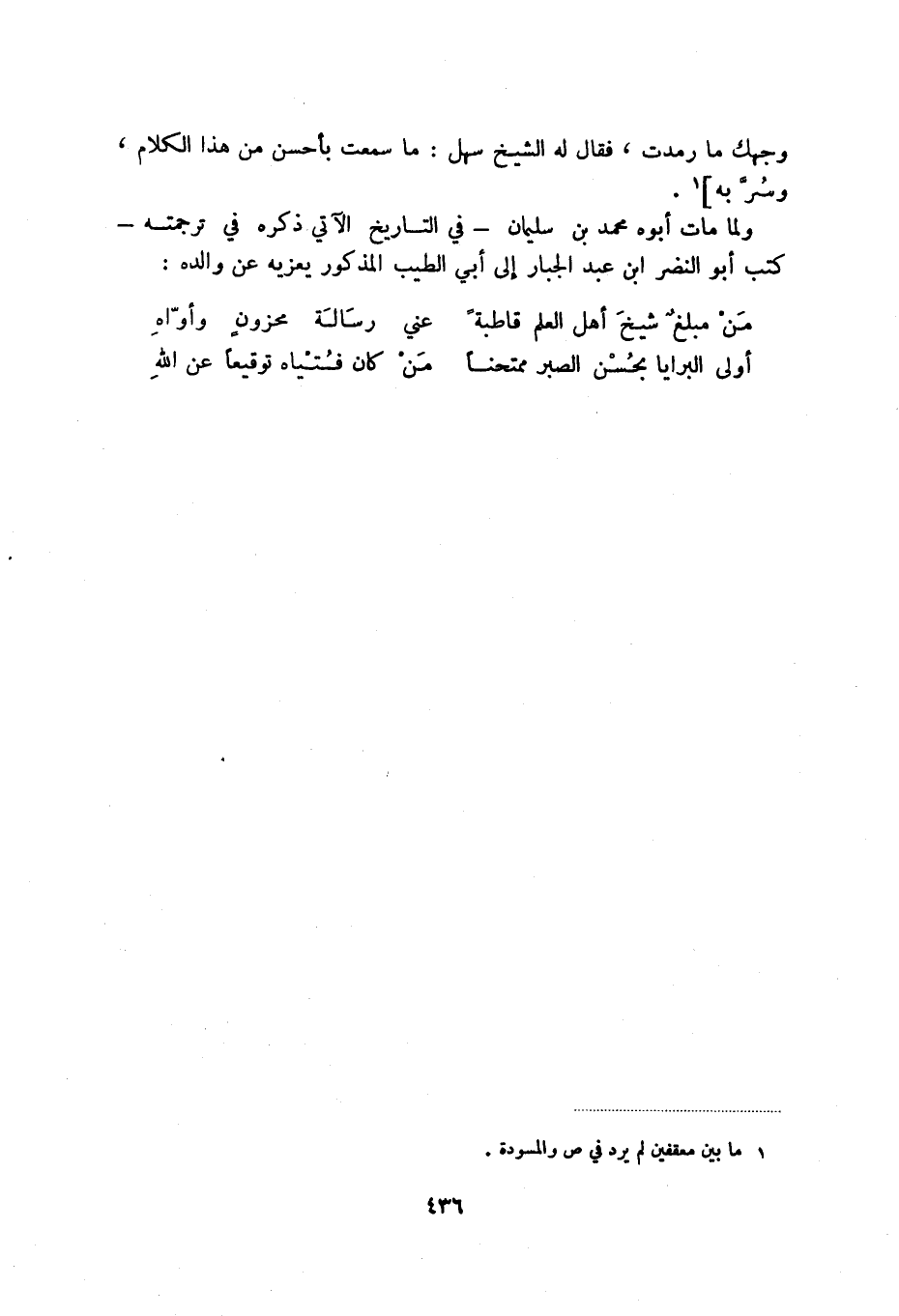 ولما مات أبوه محمد بن سليمان - في التاريخ الآتي ذكره في ترجمته - كتب أبو النضر ابن عبد الجبار إلى أبي الطيب المذكور يعزيه عن والده: