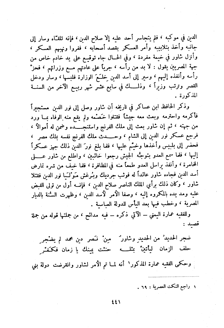 حلف الزمان ليأتين بمثله ... حنثت يمينك يا زمان فكَفرِ وحكى الفقيه عمارة المذكور (1) أنه لما تم الأمر لشاور وانقرضت دولة بني