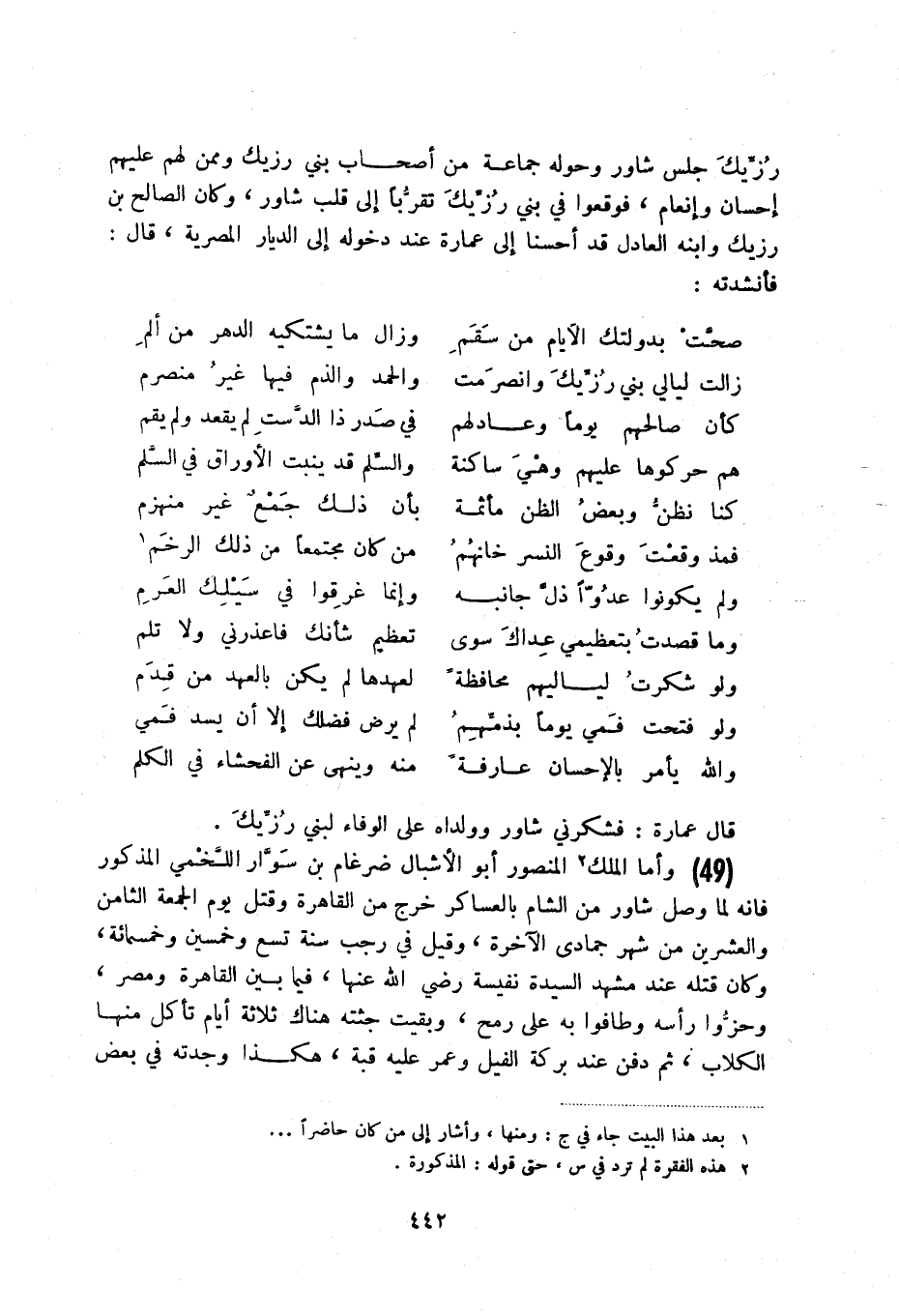 والله يأمر بالإحسان عارفة ... منه وينهى عن الفحشاء في الكلم قال عمارة: فشكرني شاور وولداه على الوفاء لبني رزيك.
