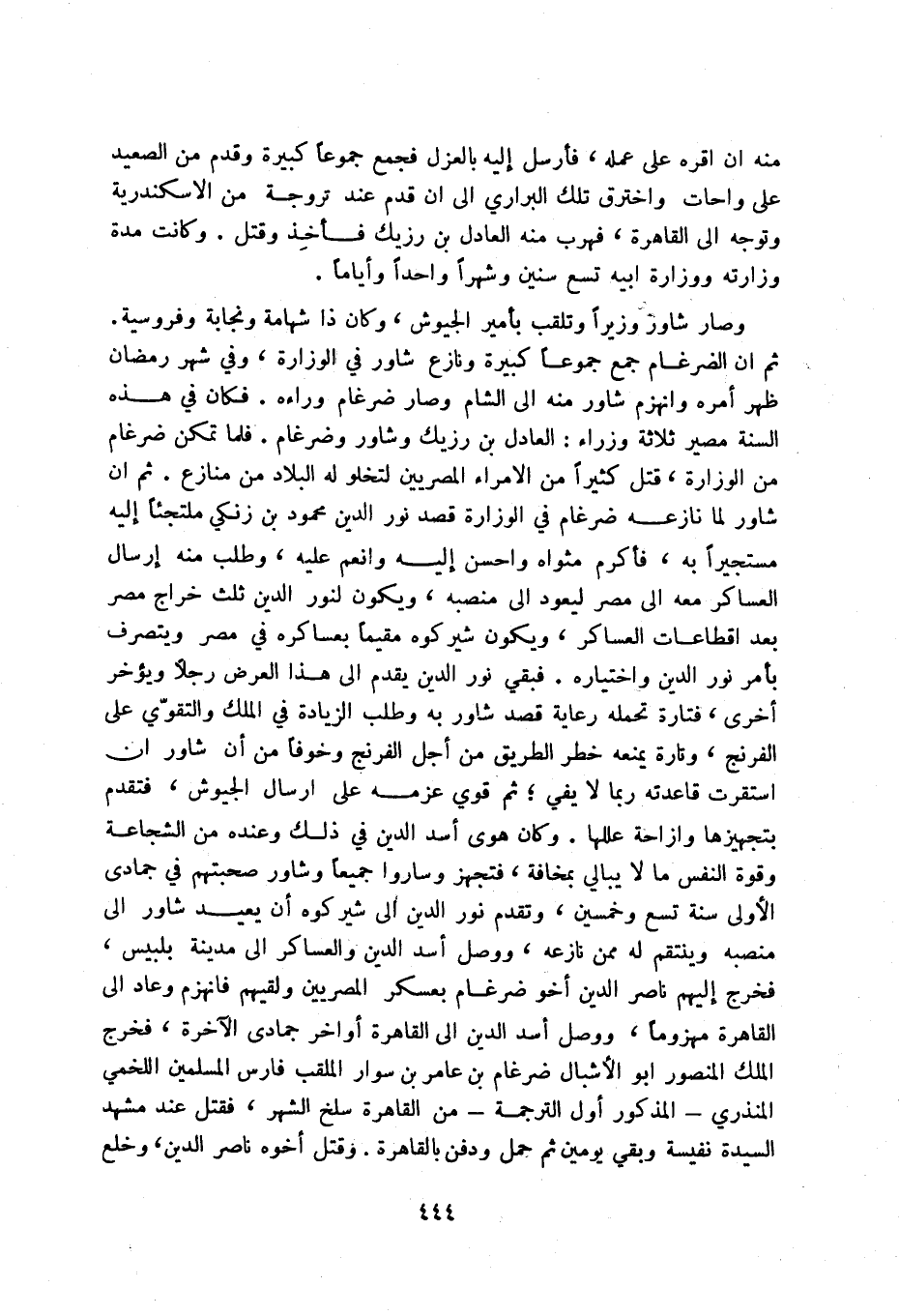 وصار شاور وزيرا تلقب بأمير الجيوش، وكان ذا شهامة ونجابة وفروسية. ثم أن الضرغام جمع جموعاً كبيرة ونازع شاور في الوزارة، وفي شهر رمضان ظهر أمره وانهزم شاور منه إلى الشام وصار ضرغام وراءه. فلما تمكن ضرغام من الوزارة، قتل كثيراً من الامراء المصريين لتخلو له البلاد من منازع. ثم ان شاور لما نازعه ضرغام في الوزارة قصد نور الدين محمود بن زنكي ملتجئاً إليه مستجيراً به، فأكرم مثواه وأحسن إليه وانعم عليه، وطلب منه إرسال العساكر معه إلى مصر ليعود إلى منصبه، ويكون لنور الدين ثلث خراج مصر بعد اقطاعات العساكر، ويكون شيركوه مقيماً بعساكره في مصر ويتصر بأمر نور الدين واختياره. وفبقي نور الدين يقدم إلى هذا العرض رجلاً ويؤخر أخرى، فتارة تحمله رعاية قصد شاور به وطلب الزيادة في الملك والتقوي على الفرنج، وتارة يمنعه خطر الطريق من أجل الفرنج وخوفاً من أن شاور أن استقرت قاعدته ربما لا يفي؛ ثم قوي عزمه على ارسال الجيوش، فتقدم بتجهيزها وازاحة عللها. وكان هوى أسد الدين في ذلك وعنده من الشجاعة وقة النفس ما لا يبالي بمخافة، فتجهز وساروا جميعاً وشاور صحبتهم في جمادى الأولى سنة تسع وخمسين، وتقدم نور الدين إلى شيركوه أن يعيد شاور إلى منصبه وينتقم له ممن نازعه، ووصل أسد الدين والعساكر إلى مدينة بلبيس، فخرج إليهم ناصر الدين أخو ضرغام بعسكر المصريين ولقيهم فانهزم وعاد إلى القاهرة مهزوماً، ووصل أسد الدين إلى القاهرة أواخر جمادى الآخرة، فخرج الملك المنصور أبو الأشبال ضرغام بن عامر بن سوار الملقب فارس المسلمين اللخمي المنذري - المذكور أول الترجمة - من القاهرة سلخ الشهر، فقتل عند مشهد السيدة نفيسة وبقي يومين ثم حمل ودفن بالقاهرة. وقتل أخوه ناصر الدين، وخلع