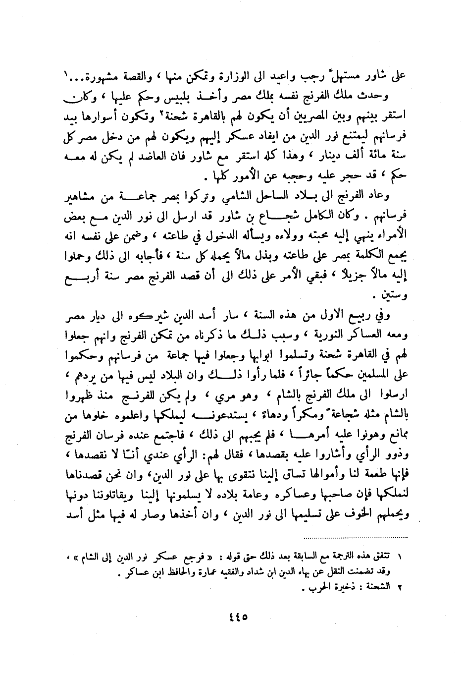 (1) تتفق هذه الترجمة مع السابقة بعد ذلك حتى قوله: " فرجع عسكر نور الدين لى الشام ". وقد تضمنت النقل عن بهاء الدين ابن شداد والفقه عمارة والحافظ ابن عساكر.