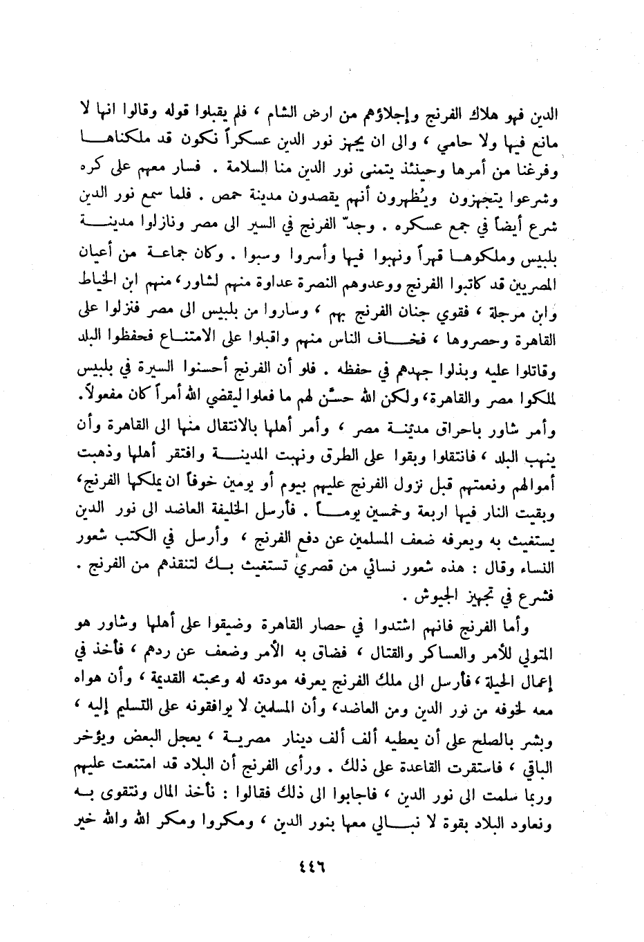 الدين فهو هلاك الفرنج وإجلاؤهم من أرض الشام، فلم يقبلوا قوله وقالوا أنها لا مانع فيها ولا حامي، وإلى أن يجهز نور الدين عسكراً نكون قد ملكناها وفرغنا من أمرها وحينئذ يتمنى نور الجين منا السلامة. فسار معهم على كره وشرعوا يتجهزون ويظهرون أنهم يقصدون مدينة حمص. فلما سمع نور الدين شرع أيضاً في جمع عسكره. وجد الفرنج في السير إلى مصر ونازلوا مدينة بلبيس وملكوها قهراً ونهبوا فيها وأسروا وسبوا. وكان جماعة من أعيان المصريين قد كاتبوا الفرنج ووعدوهم النصرة عداوة منهم لشاور، منهم ابن الخياط وابن مرجلة، فقوي جنان الفرنج بهم، وساروا من بلبيس إلى مصر فنزلوا على القاهرة وحصروها، فخاف الناس منهم واقبلوا على الامتناع فحفظوا البلد وقاتلوا عليه وبذلوا جهدهم في حفظه. فلو أن الفرنج أحسنوا السيرة في بلبيس لملكوا مصر والقاهرة، ولكن الله حسن لهم ما فعلوا ليقضي الله أمراً كان مفعولاً. وأمر شاور باحراقها مدينة مصر، وامر أهلها بالانتقال منها إلى القاهرة وان ينهب البلد، فانتقلوا وبقوا على الطرق ونهبت المدينة وافتقر أهلها وذهبت أموالهم ونعمتهم قبل نزول الفرنج عليهم بيوم أو يومين خوفاً أن يملكها الفرنج، وبقيت النار فيها أربعة وخمسين يوماً. فأرسل الخليفة العاضد إلى نور الدين يستغيث به ويعرفه ضعف المسلمين عن دفع الفرنج، وأرسل في الكتب شعور النساء وقال: هذه شعور نسائي من قصر تستغيث بك لتنقذهم من الفرنج. فشرع في تجهيز الجيوش.