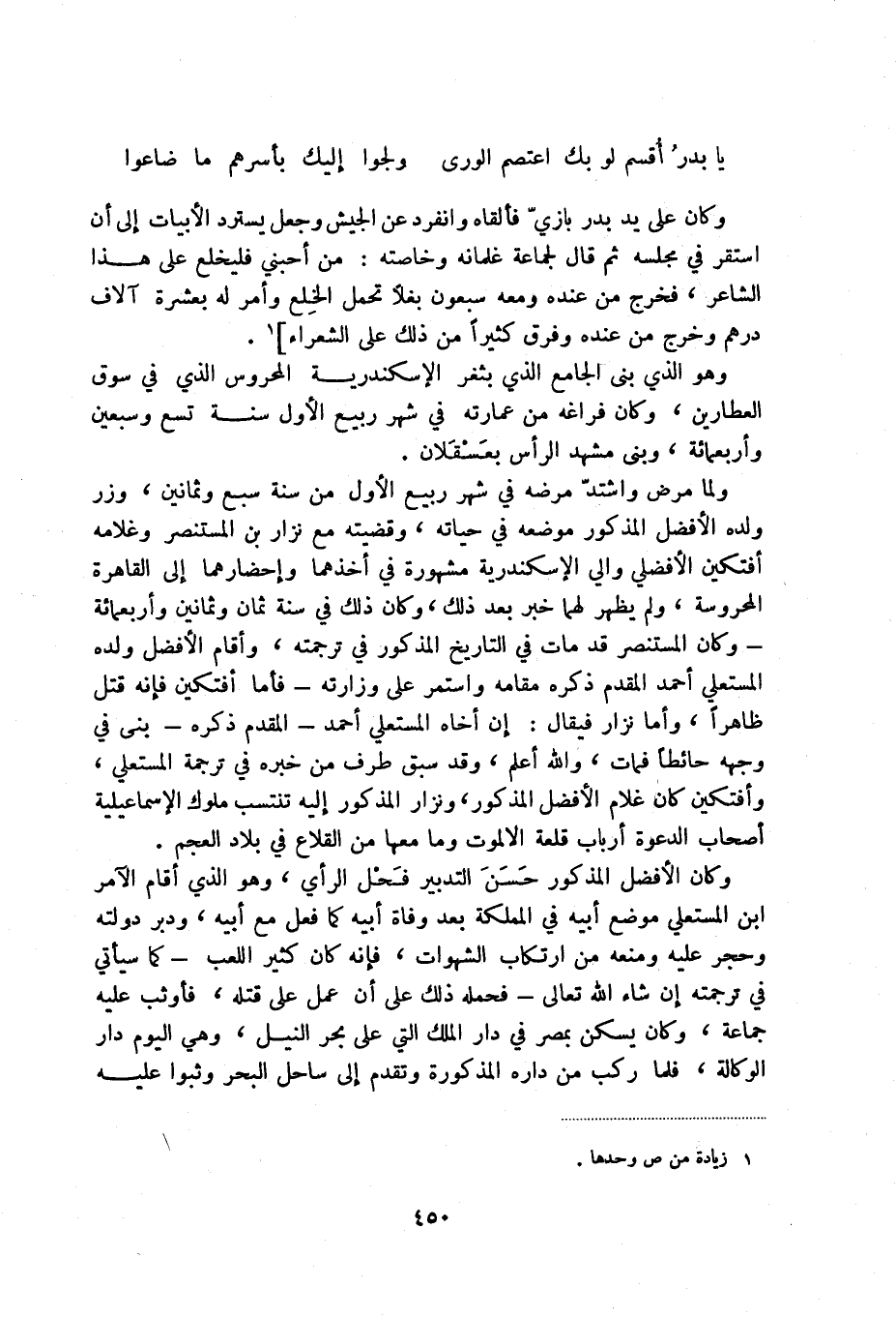 يا بدر أقسم لو بك اعتصم الورى ... ولجوا إليك بأسرهم ما ضاعوا وكان على يد بدر بازي فألقاه وانفرد عن الجيش وجعل يسترد الأبيات إلى أن استقر في مجلسه ثم قال لجماعة غلمانه وخاصته: من أحبني فليخلع على هذا الشاعر، فخرج من عنده ومعه سبعون بغلاً تحمل الخلع وأمر له بعشرة آلاف درهم وخرج من عنده وفرق كثيراً من ذلك على الشعراء] (1) .