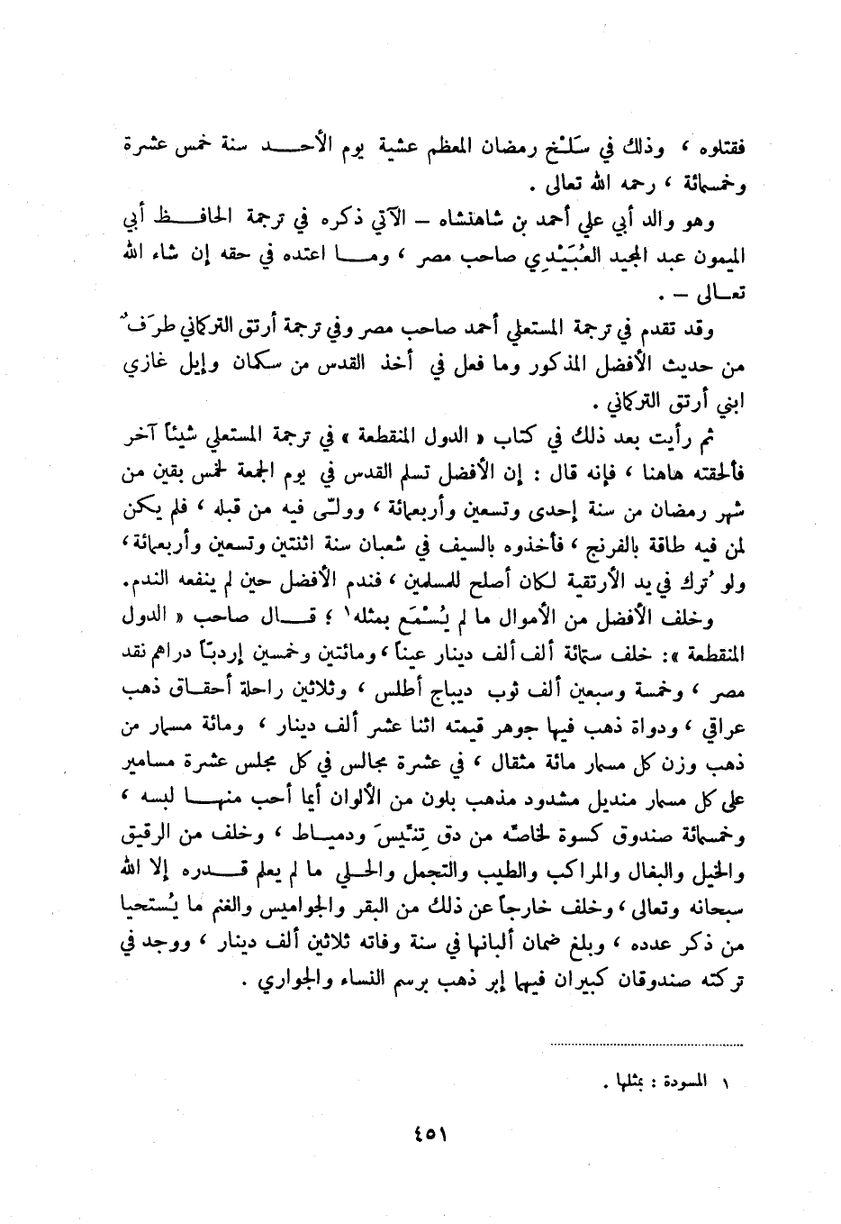 وقد تقدم في ترجمة المستعلي أحمد صاحب مصر وفي ترجمة أرتق التركماني طرف من حديث الأفضل المذكور وما فعل في أخذ القدس من سكمان وغيل غازي ابني أرتق التركماني.