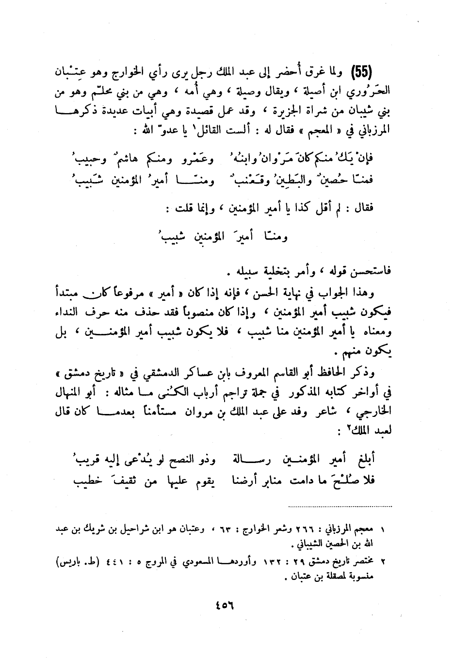 (55) ولما غرق أحضر إلى عبد الملك رجل يرى رأي الخوارج وهو عتبا الحروري ابن أصيلة، ويقال وصيلة، وهي أمه، وهي من بني محلم وهو من بني شيبان من شراة الجزيرة، وقد عمل قصيدة وهي أبيات عديدة ذكرها المرزباني في " المعجم " فقال له: ألست القائل (1) يا عدو الله: