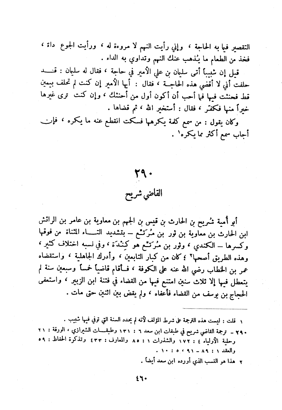 (2) ترجمة القاضي شريح في طبقات ابن سعد 6: 131 وطبقات الشيرازي، الورقة: 21 وحلية الأولياء 4: 172 والشذرات 1: 85 والمعارف: 433 وتذكرة الحفاظ: 59 والعقد 1: 89 - 91، 5: 10.