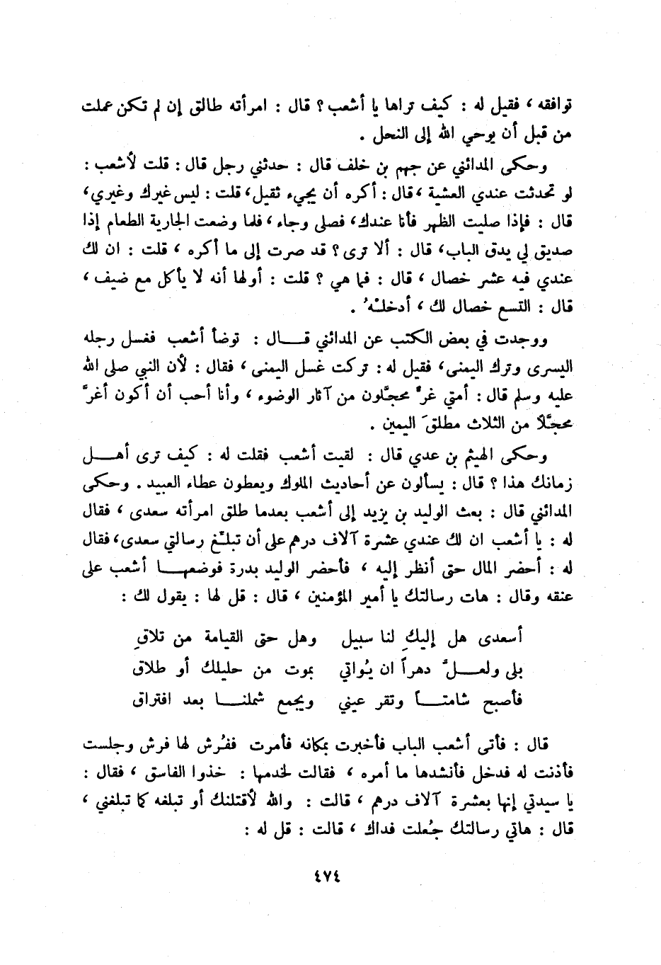 فأصبح شامتاً وتقر عيني ... ويجمع شملنا بعد افتراق قال: فأتى أشعب الباب فأخبرت بمكانه فأمرت ففرش لها فرش وجلست فأذنت له فدخل فأنشدها ما أمره، فقالت لخدمها: خذوا الفاسق، فقال: يا سيدتي إنها بعشرة آلاف درهم، قالت: والله لأقتلنك أو تبلغه كما تبلغني، قال: هاتي رسالتك جعلت فداك، قالت: قل له:
