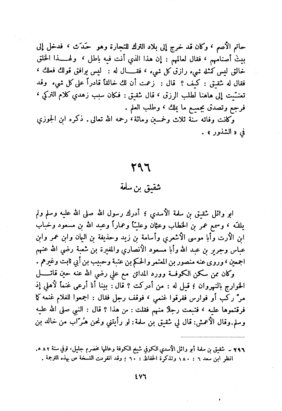 (1) شقيق بن سلمة أبو وائل الأسدي الكوفي شيخ الكوفة وعالمها مخضوم جليل، توفي سنة 82هـ. انظر ابن سعد 6: 180 وتذكرة الحفاظ: 60؛ وقد انفردت النسخة ص بهذه الترجمة.