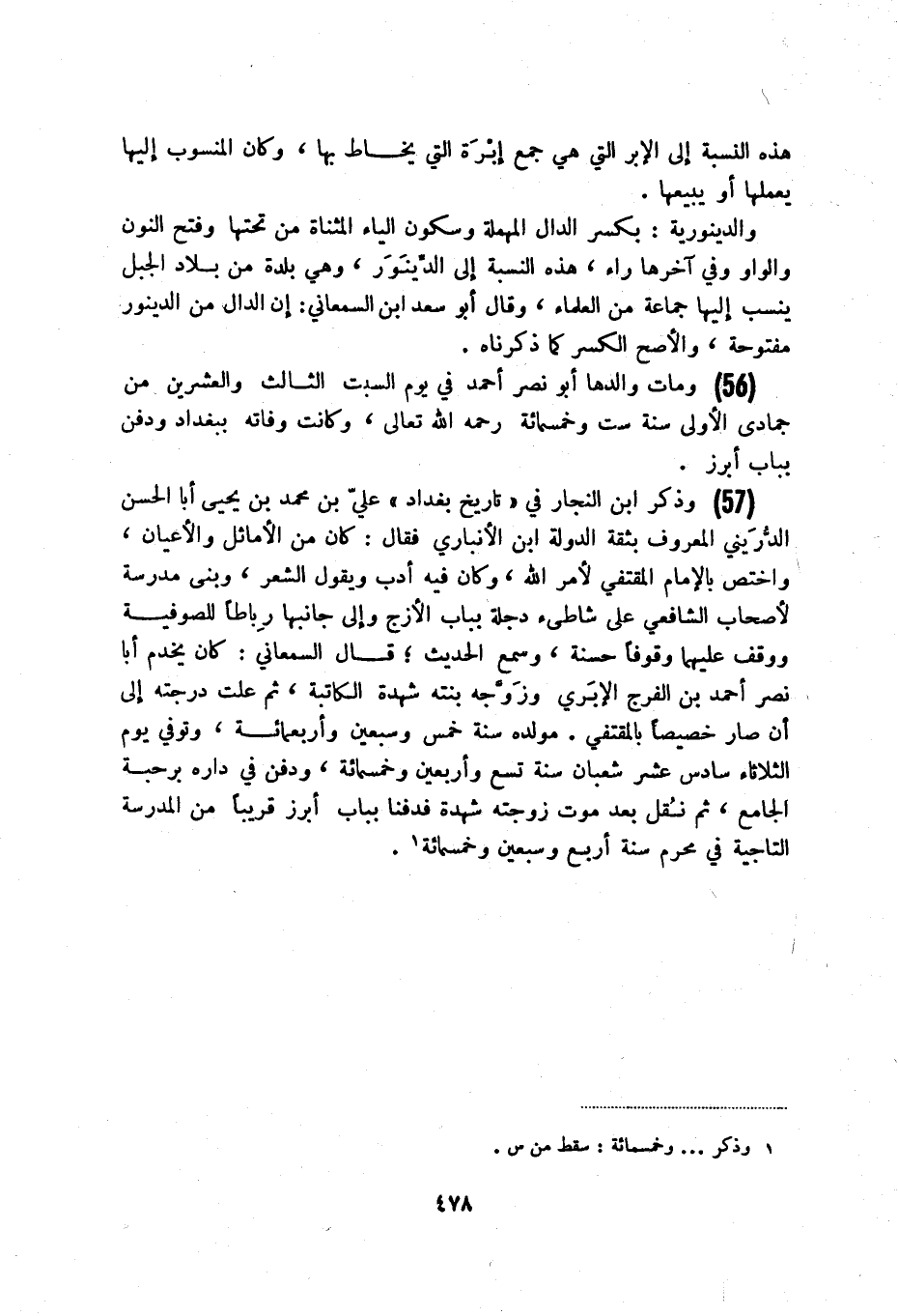 (56) ومات والدها أبو نصر أحمد في يوم السبت الثالث والعشرين من جمادى الأولى سنة ست وخمسمائة رحمه الله تعالى، وكانت وفاته ببغداد ودفن بباب أبرز.