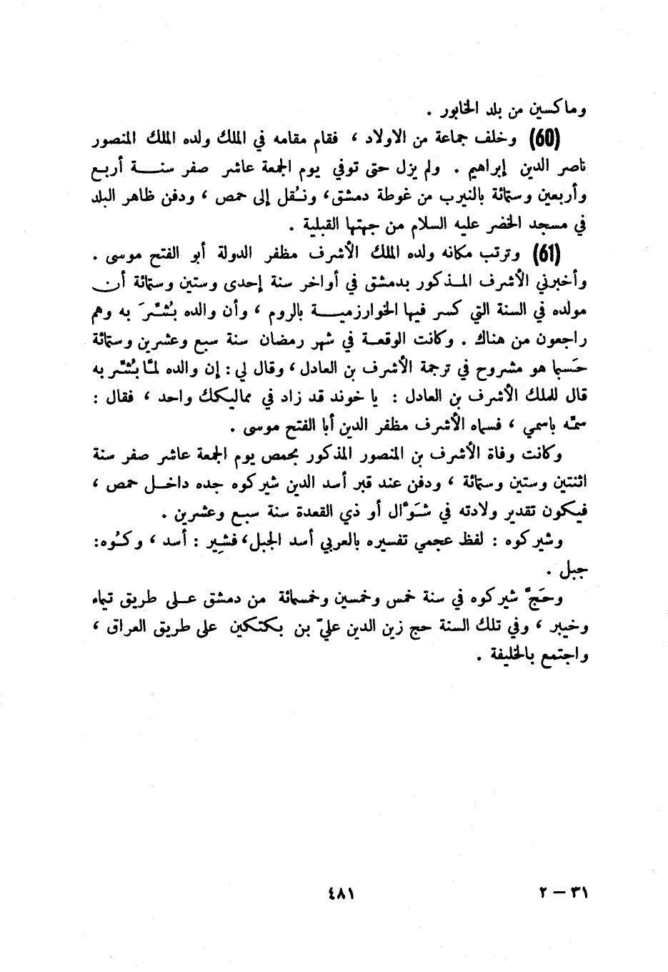 (60) وخلف جماعة من الأولاد، فقام مقامه في الملك ولده الملك المنصور ناصر الدين إبراهيم. ولم يزل حتى توفي يوم الجمعة عاشر صفر سنة أربع وأربعين وستمائة بالنيرب من غوطة دمشق، ونقل إلى حمص، ودفن ظاهر البلد في مسجد الخضر عليه السلام من جههتها القبلية.