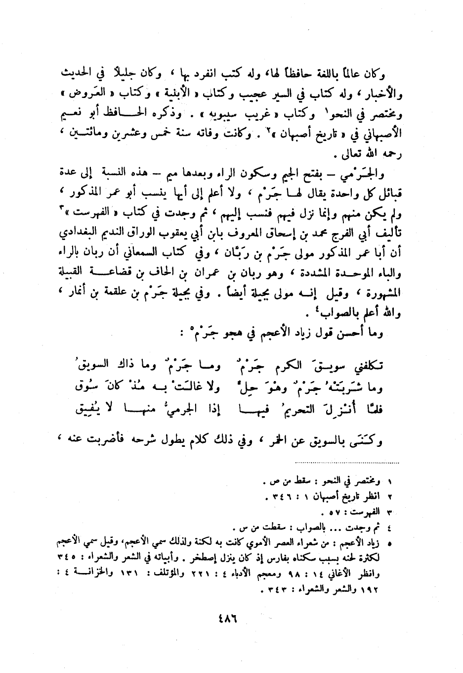 والجرمي - بفتح الجيم وسكون الراء وبعدها ميم - هذه النسبة إلى عدة قبائل كل واحدة يقال لها جرم، ولا أعلم إلى أيها ينسب أبو عمر المذكور، ولم يكن منهم وإنما نزل فيهم فنسب غليهم، ثم وجدت في كتاب " الفهرست " (3) ، تأليف أبي الفرج محمد بن إسحاق المعروف بابن أبي يعقوب الوراق النديم البغدادي أن أبا عمر المذكور مولى جرم بن ربان، وفي كتاب السمعاني أن ربان بالراء والباء الموحدة المشددة، وهو ربان بن عمران بن الحاف بن قضاعة القبيلة المشهورة، وقيل إنه مولى بجيلة أيضاً. وفي بجيلة جرم بن علقمة بن أنمار، والله اعلم بالصواب (4) .