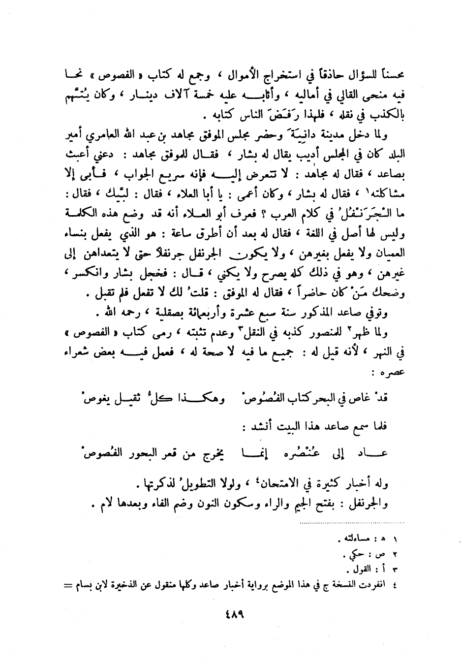 ولما ظهر (2) للمنصور كذبه في النقل (3) وعدم تثبيته، رمى كتاب " الفصوص " في النهر، لأنه قيل له: جميع ما فيه لا صحة له، فعمل فيه بعض شعراء عصره: