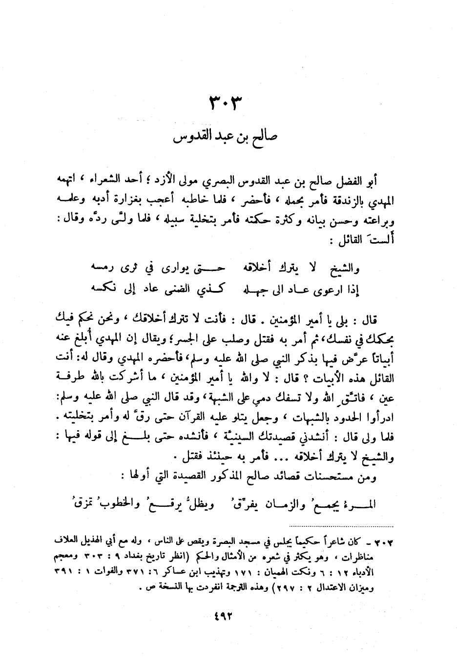 (1) كان شاعراً حكيماً يجلس في مسجد البصرة ويقص على الناس، وله مع أبي الهذيل العلاف مناظرات، وهو يكثر في شعره من الأمثال والحكم (انظر تاريخ بغداد 9: 303 ومعجم الأدباء 12: 6 ونكت الهميان: 171 وتهذيب ابن عساكر 6: 371 والفوات 1: 391 وميزان الاعتدال 2: 297) وهذه الترجمة انفردت بها النسخة ص.