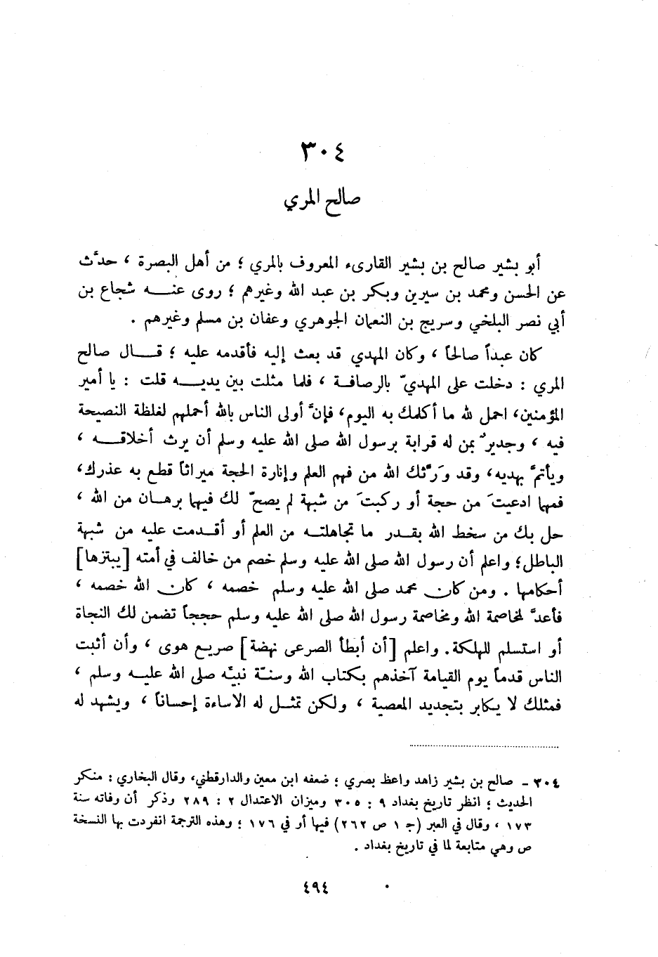 (1) صالح بن بشير زاهد واعظ بصري؛ وضعه ابن معين والدارقطني، وقال البخاري: منكر الحديث؛ انظر تاريخ بغداد 9: 305 وميزان الاعتدال 2: 289 وذكر أن وفاته سنة 173، وقال في العبر (ج 1 ص 262) فيها أو في 176؛ وهذه الترجمة انفردت بها النسخة ص وهي متابعة لما في تاريخ بغداد.