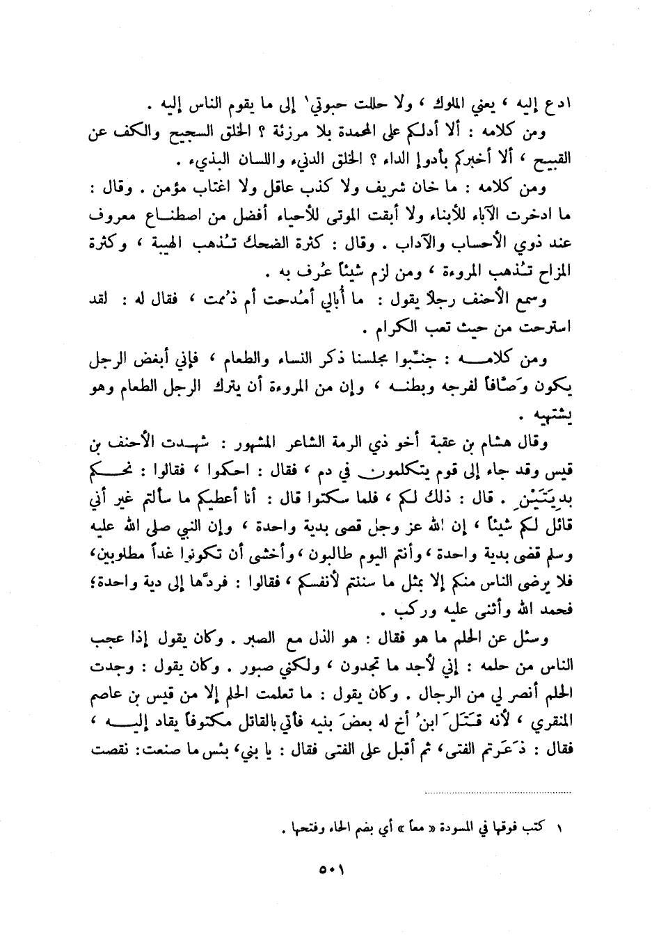 وقال هشام بن عقبة أخو ذي الرمة الشاعر المشهور: شهدت الأحنف بن قيس وقد جاء إلى قوم يتكلمون في دم، احكموا، فقالوا: نحكم بديتين. قال: ذلك لكم، فلما سكتوا قال: أنا أعطيكم ما سألتم غير أني قائل لكم شيئاً، إن لله عز وجل قضى بدية واحدة، وإن النبي صلى الله عليه وسلم قضى بدية واحدة، وأنتم اليوم طالبون، وأخشى أن تكونوا غداً مطلوبين، فلا يرضى الناس منكم إلا بمثل ما سننتم لأنفسكم، فقالوا: فردها إلى دية واحدة؛ فحمد الله وأثنى عليه وركب.